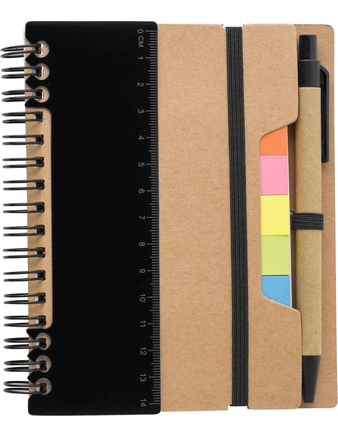 Libreta de papel reciclado, con espiral. Tiene 60 páginas lineadas, notas adhesivas en cinco colores, 25 de cada color, regla y bolígrafo con tinta negra.