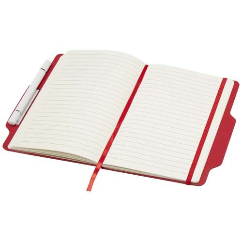 La libreta de tapa dura A5 con combinación de bolígrafo y lápiz cuenta con 80 hojas rayadas en color crema de 70 g/m², esquinas redondeadas, cierre elástico y marcador de cinta. El bolígrafo tiene dos lados: uno es un bolígrafo con tinta negra y el otro es un lápiz. Longitud de escritura del bolígrafo: 1000 metros. Tamaño del plumín: 1,00 mm.