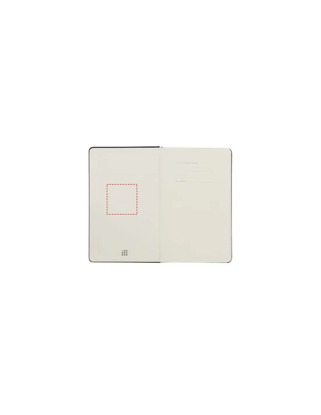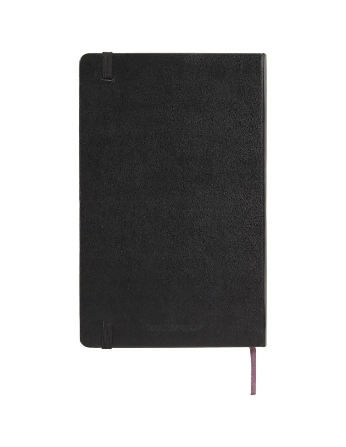 Libreta grande de tapa dura en negro (más vendido), además de en una gama de colores intensos y elegantes. Presenta esquinas redondeadas, cierre elástico y cinta marcapáginas. Bolsillo extensible en cartón y tela en el interior de la contraportada. Contiene 240 páginas cuadriculadas de color marfil.
