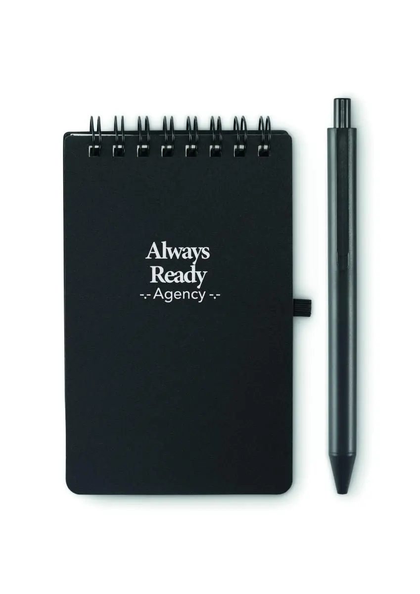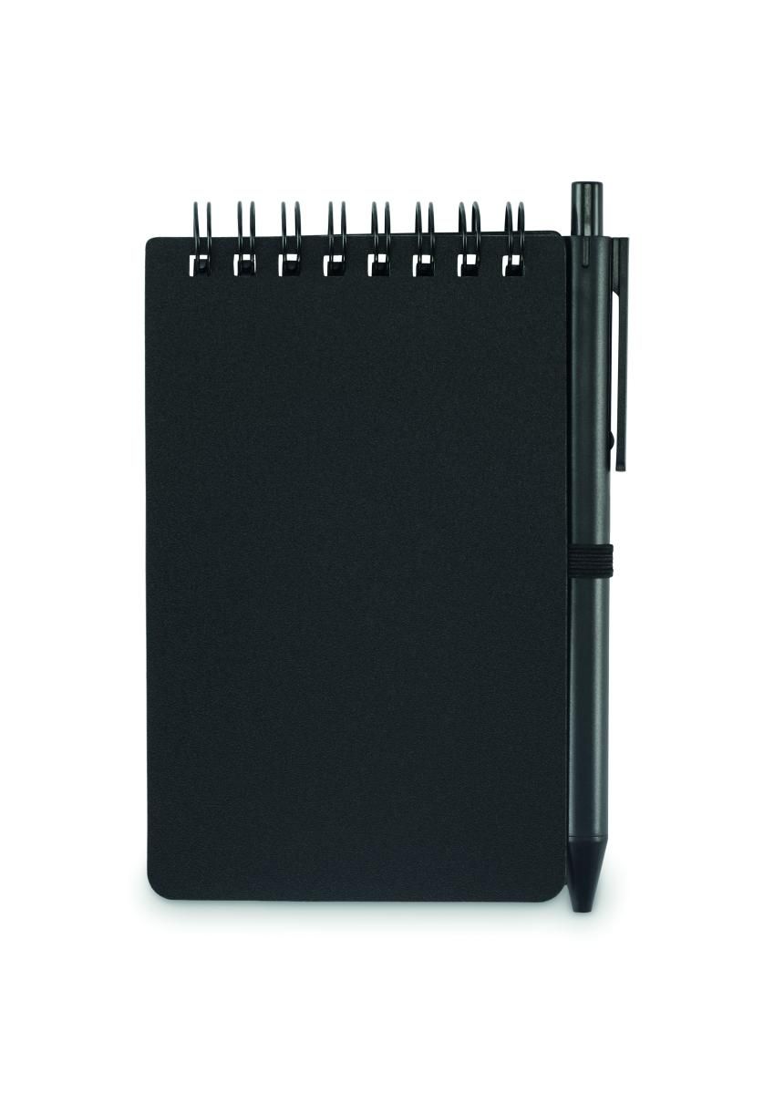 Libreta hidrófuga con cubierta de PP y bolígrafo incluido de tinta azul. Doble hilo. Papel mineral 120 gr/m², 50 hojas rayadas. Cinta elástica de c…