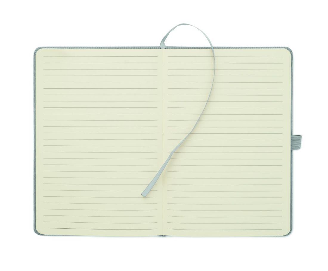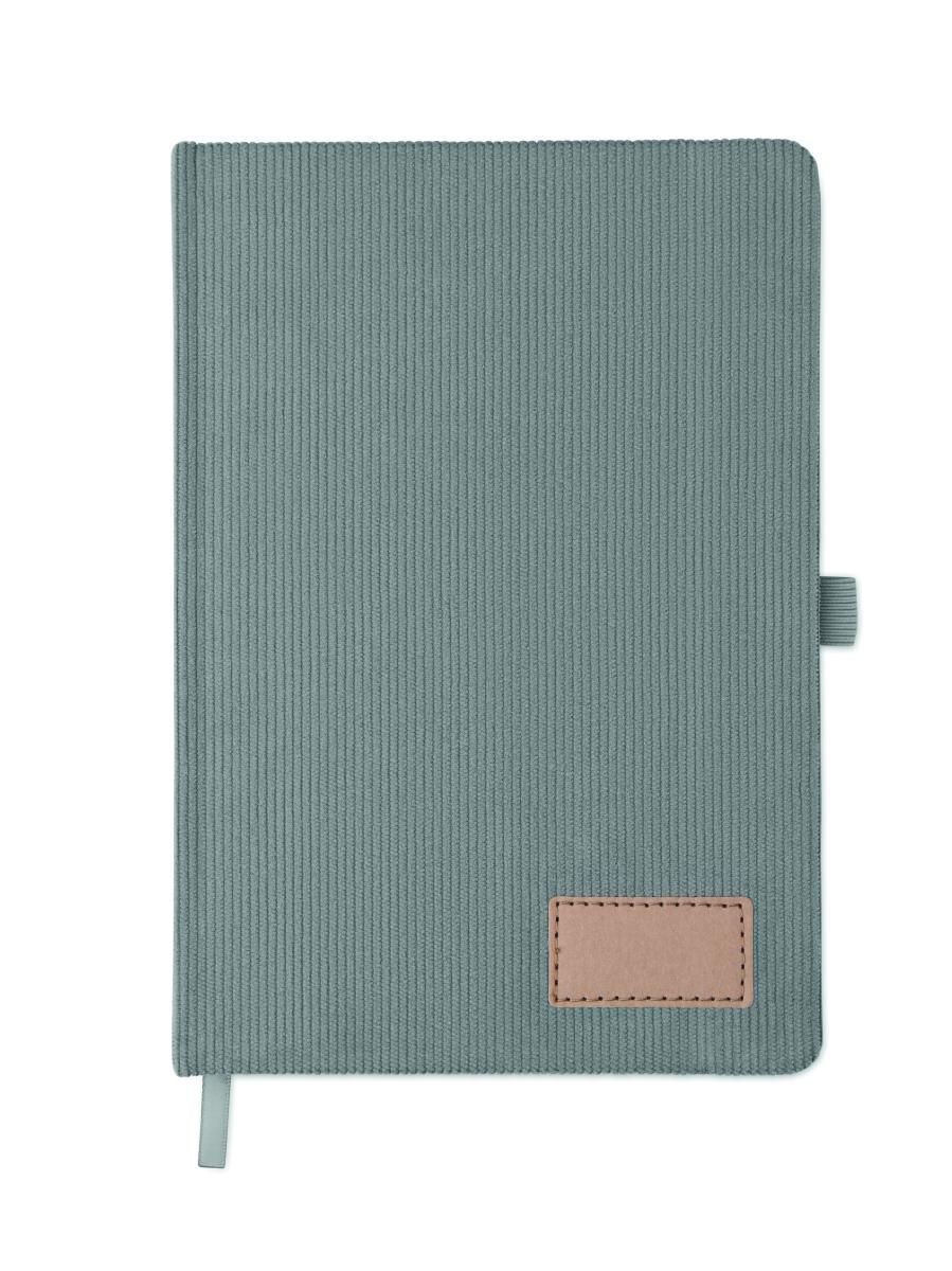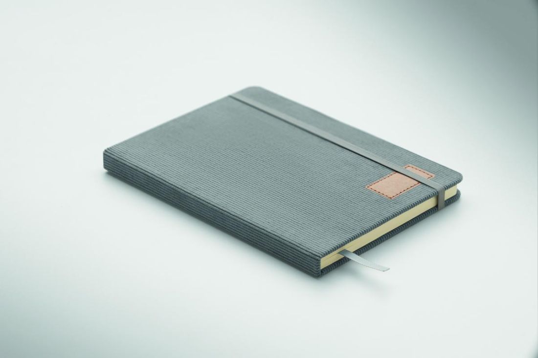 Libreta A5 con cubierta de pana dura de poliéster RPET 192 páginas de papel reciclado rayado (70 gr/m2). Diseño en cartoné. banda elástica y cinta marcapáginas. Etiqueta de papel kraft lavado.