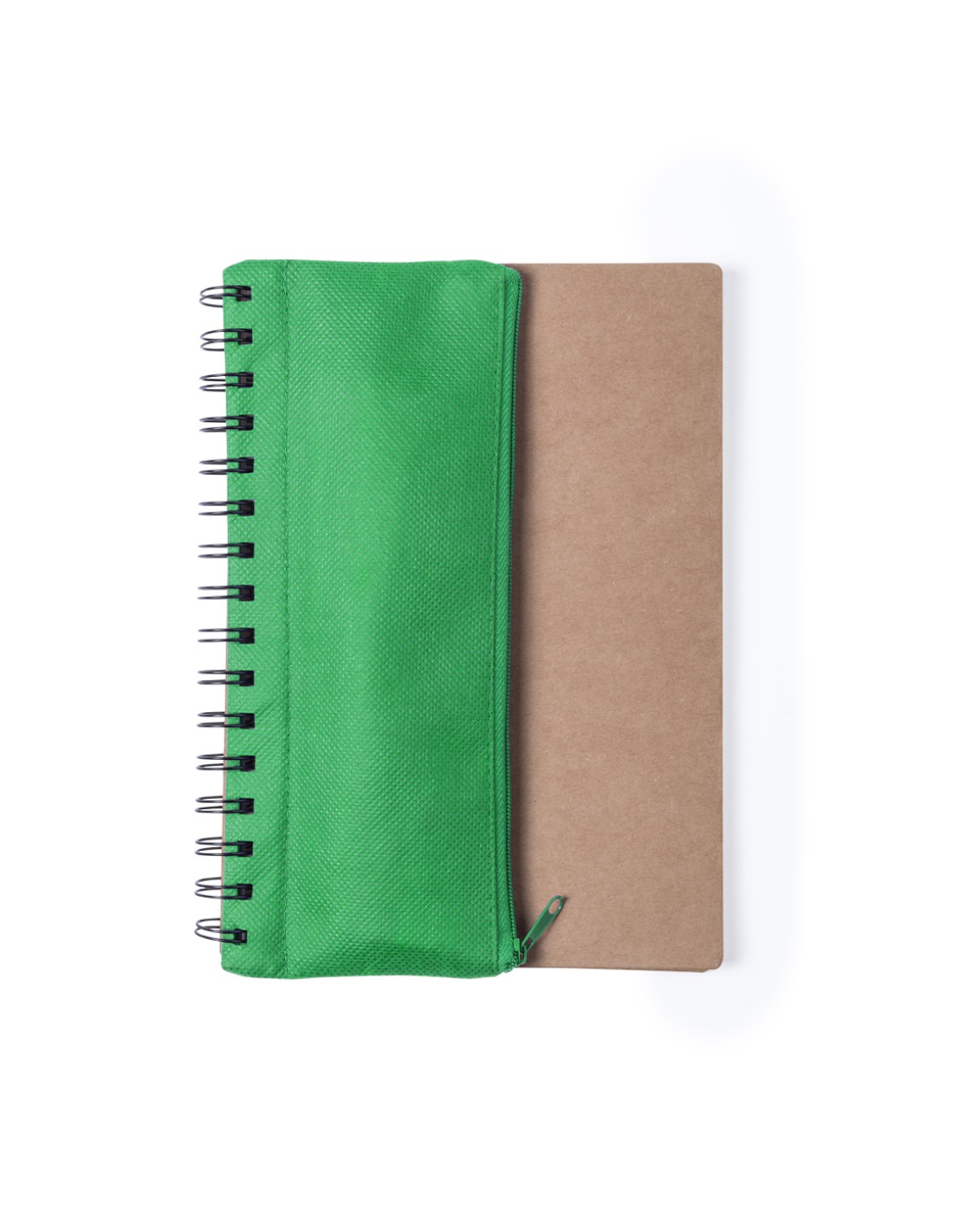 Libreta de anillas con tapas de suave tacto acabadas en resistente cartón reciclado. Con estuche en poliéster 600D de vivos colores y cierre de cremallera integrado en portada. Incluye bolígrafo en cartón reciclado y set de regla, lápices y sacapuntas en madera natural. 70 hojas lisas.
