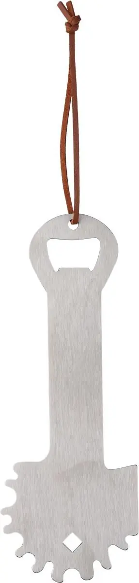 Limpiador de barbacoa de acero inoxidable con función de abridor de botellas integrado. Incluye un cordón de PU para colgarlo fácilmente. Presentado en una funda de papel Kraft.