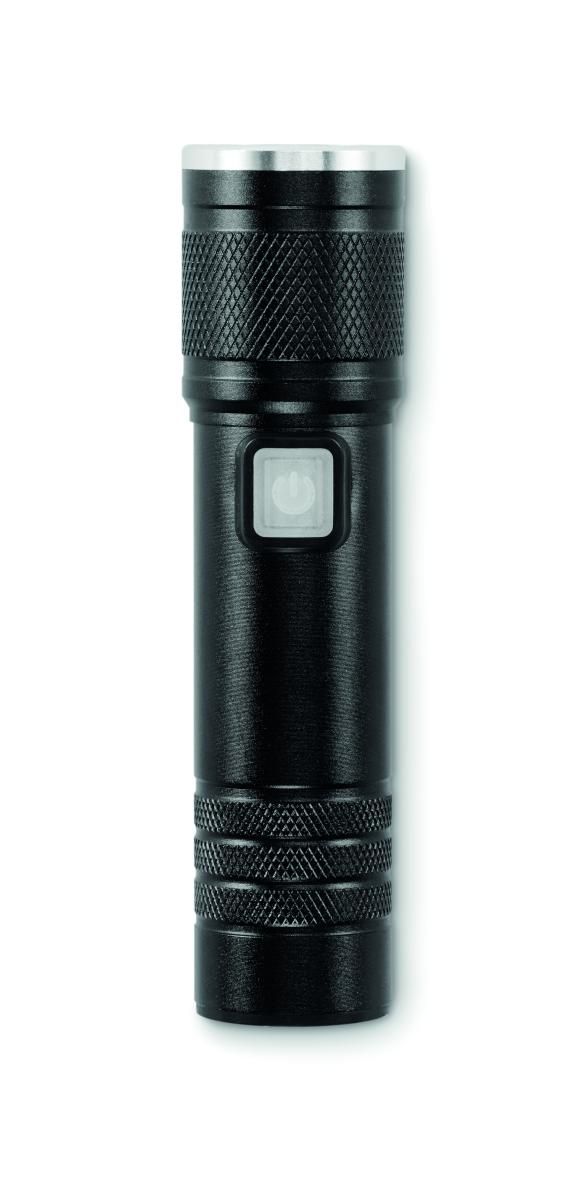 Linterna de luz COB recargable y extendible de aluminio reciclado. 100 lúmenes con 3 ajustes de luz y función de zoom. Batería recargable integrada de 800 mAh. Cable de carga incluido.