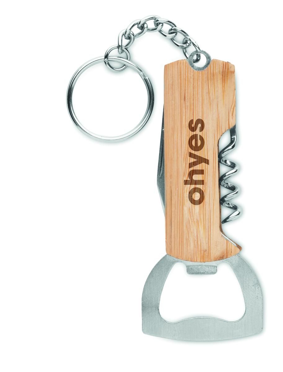 Llavero multi herramienta 3 en 1 con funda de bambú y llavero. Incluye abrebotellas, sacacorchos para vino y navaja.