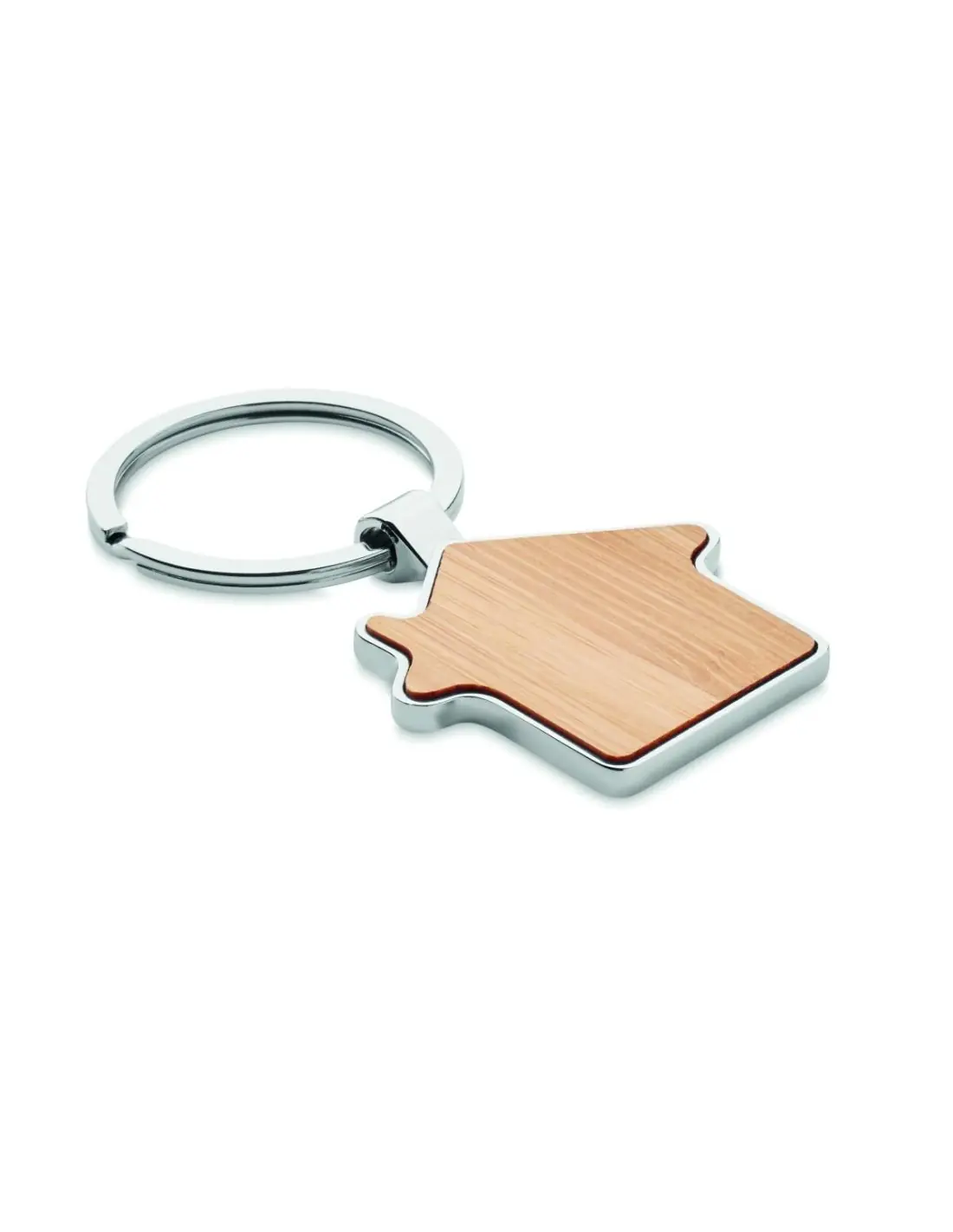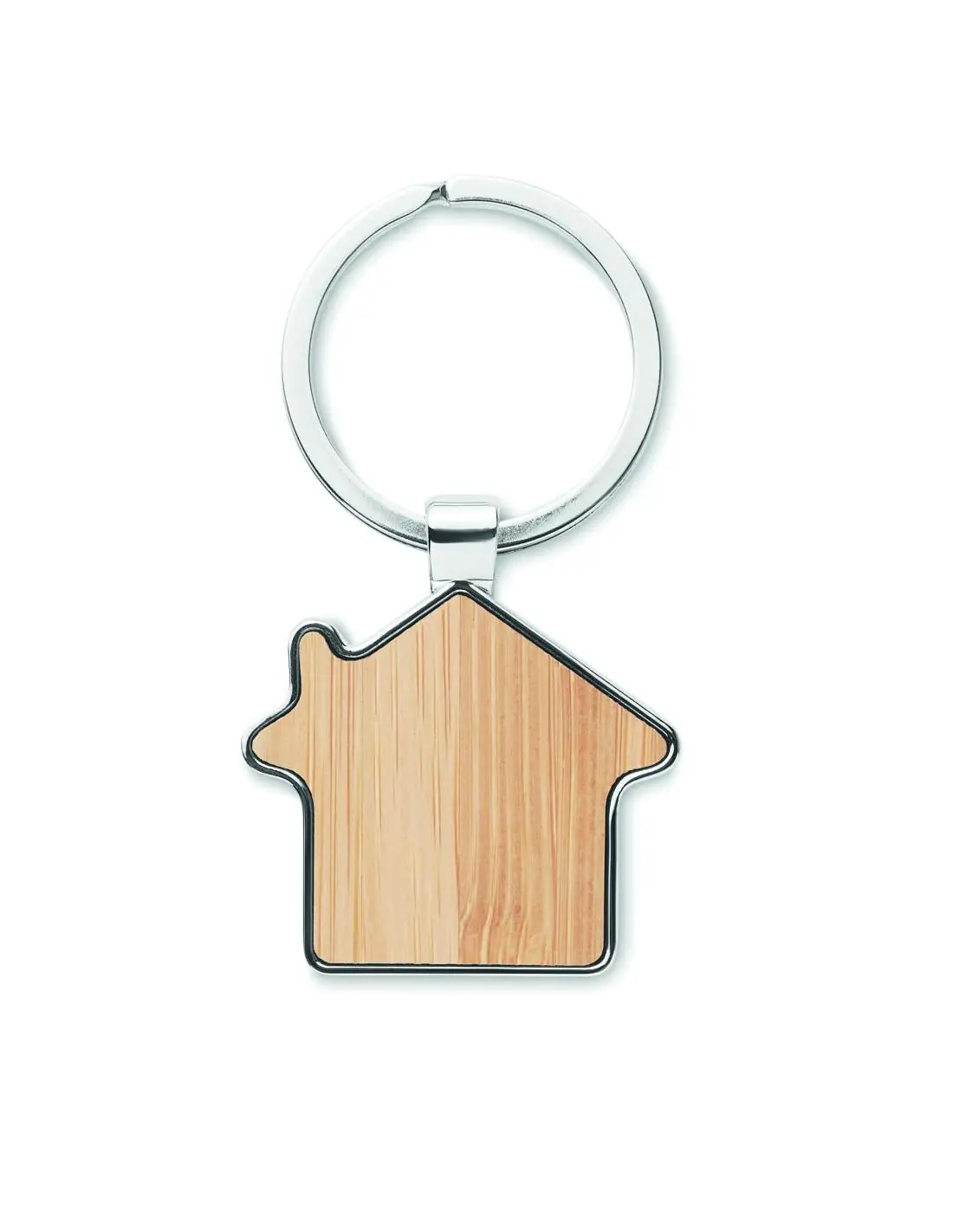 Llavero casa de aleación de zinc con un cara de bambú. El bambú es un producto natural, puede haber ligeras variaciones en el color y el tamaño por artículo, lo que puede afectar el resultado final de la impresión.