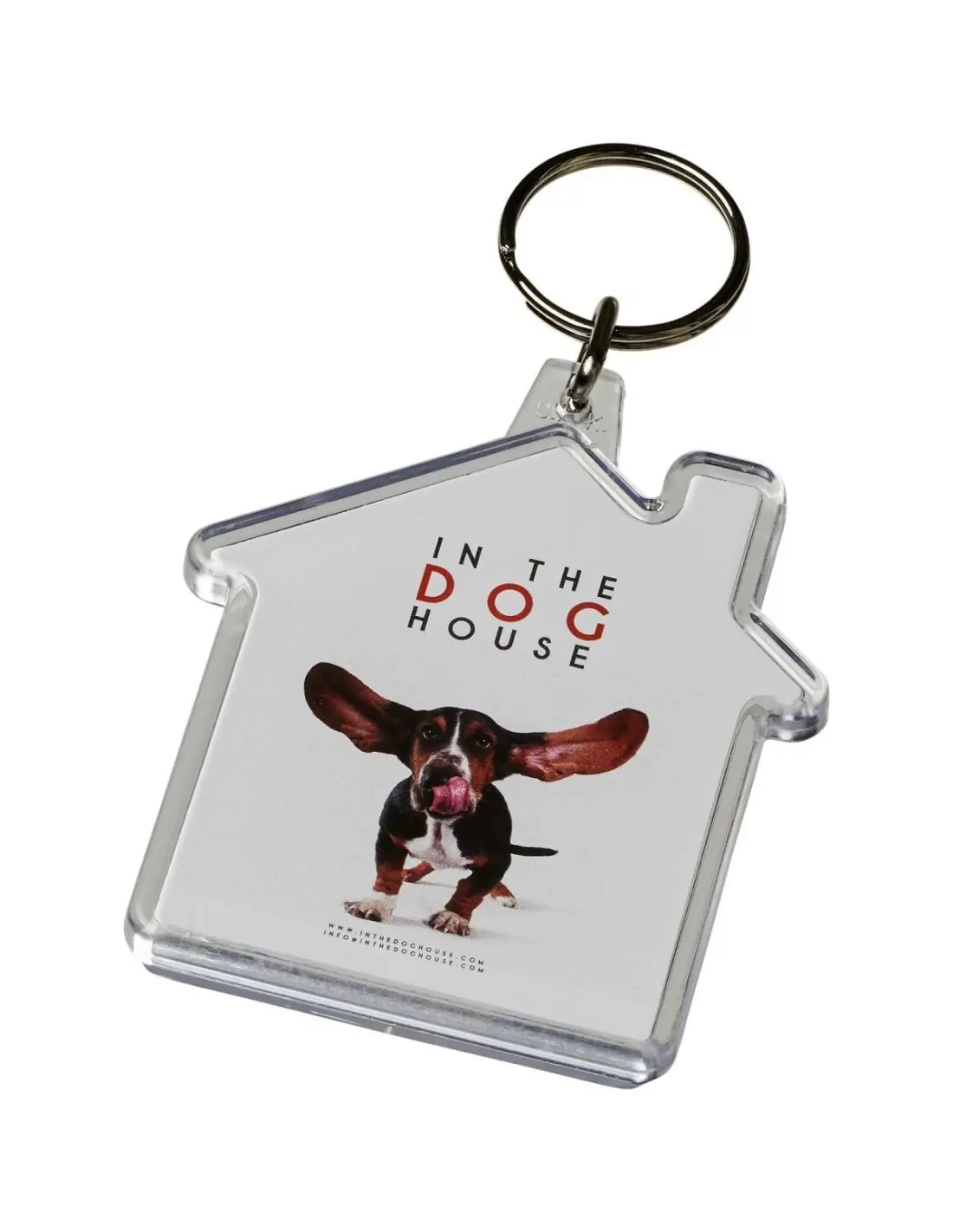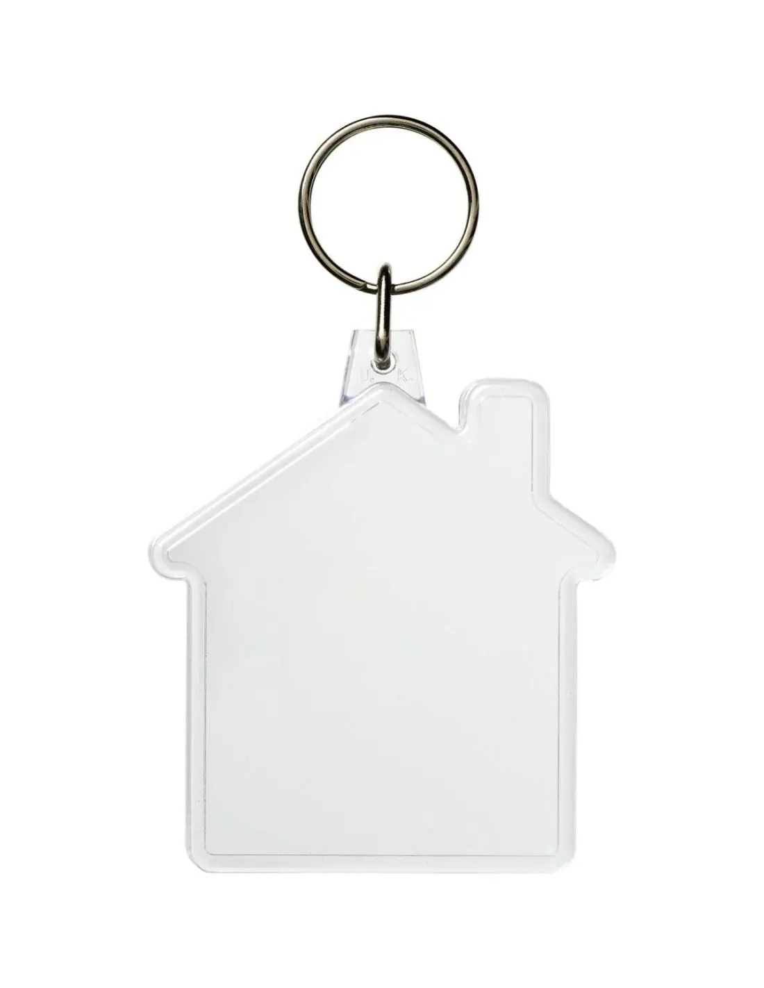 Llavero transparente con forma de casa con anilla abierta de metal. La anilla de metal es de perfil plano, ideal para envíos por correo postal. Dimensiones del encarte impreso: 5,9 x 5,6 cm.