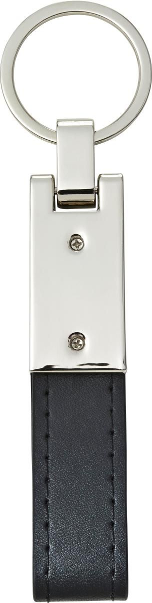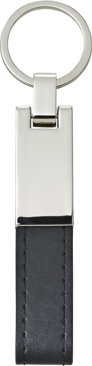 Llavero de acero con placa en color plata y trabilla de PU. Presentado en caja de regalo.