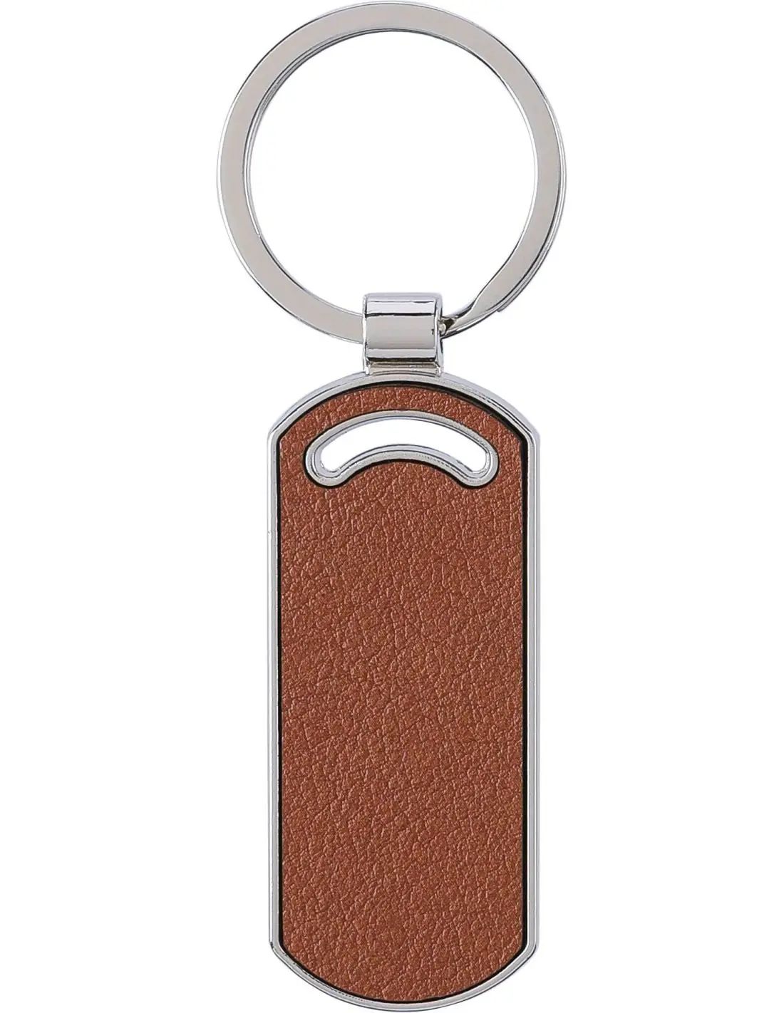Llavero de cuero reciclado con aro de metal. Forma ovalada. Incluye logotipo de cuero reciclado grabado en el lateral. Presentado en una funda de cartón marrón.