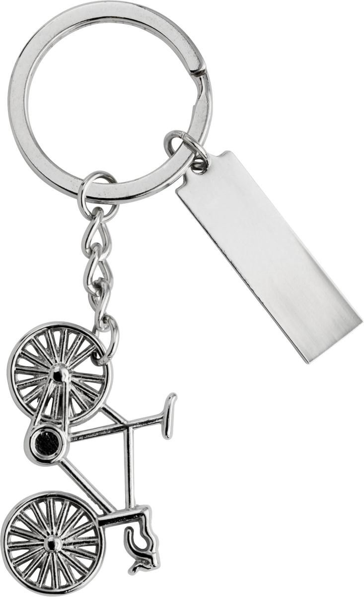 Llavero de níquel en forma de bicicleta, con una placa rectangular para la personalización. Presentado en caja de regalo.