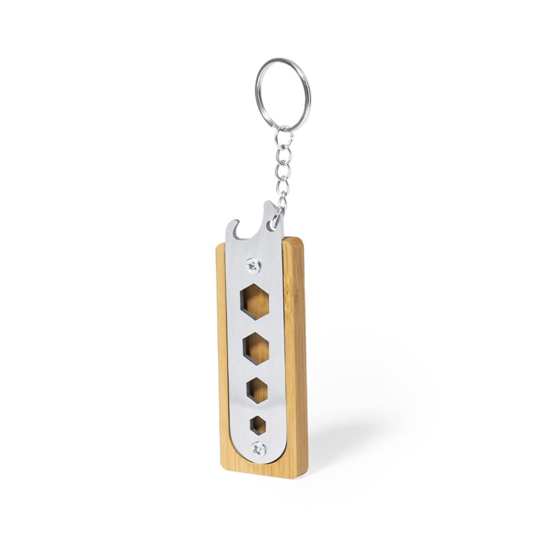 Llavero multiherramienta fabricado en resistente acero inox y bambú. Con práctico conjunto de 4 llaves fijas hexagonales troqueladas y abrebotellas. Presentado en caja individual de diseño kraft.