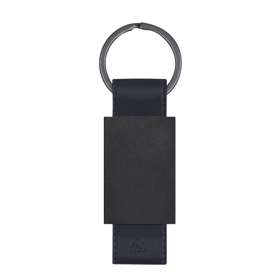 Llavero de divertido diseño con cinta de PU reciclado. Con cuerpo negro en acabado mate.