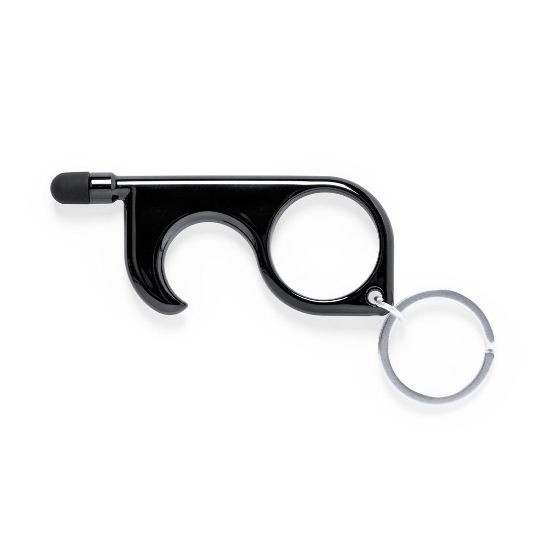Llavero higiénico anti-contacto con bolígrafo y puntero integrados. Fabricado en resistente ABS de acabado metalizado y disponible en variada gama de colores. Especialmente diseñado para evitar tocar con las manos superficies de uso común (picaportes de puertas, interruptores, grifos de uso público, cajeros automáticos...). Con cómodo troquel para el dedo y presentado en bolsa individual de diseño. Recomendado para marcaje en tampografía.