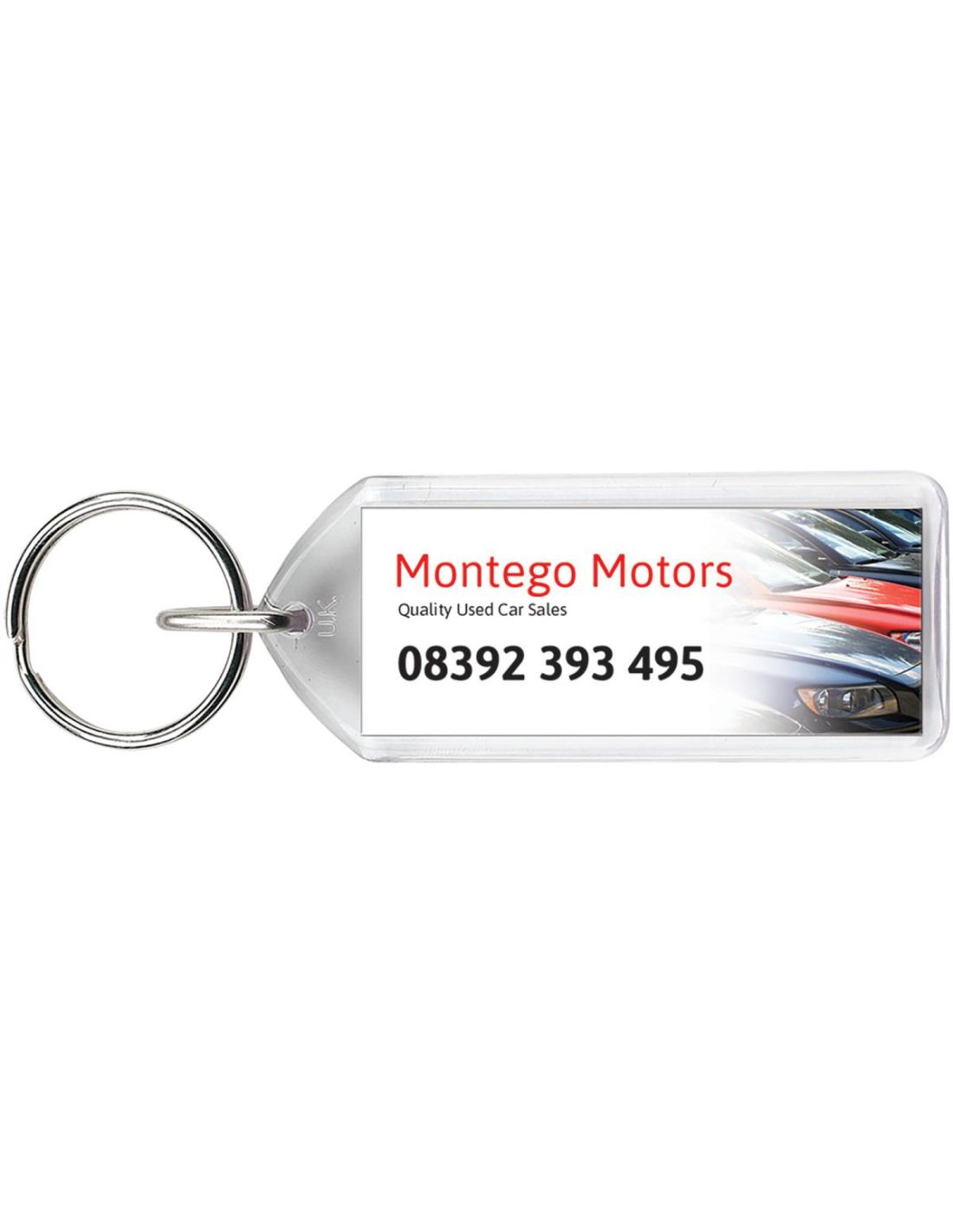 Llavero rectangular transparente F1 con anilla abierta de metal. Este llavero puede abrirse de nuevo con una moneda. La anilla de metal es de perfil plano, ideal para envíos por correo postal. Dimensiones del encarte impreso: 5 x 2,0 cm.