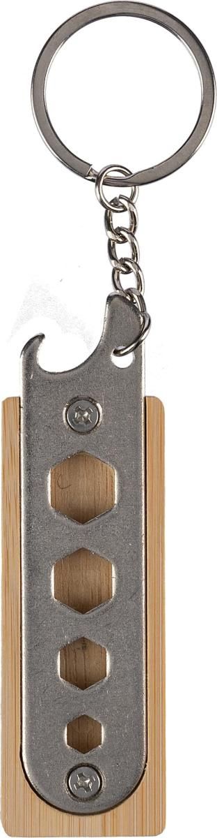 Llavero de bambú con abrebotellas y 4 herramientas de llave en el interior. Presentado en una caja de cartón marrón.