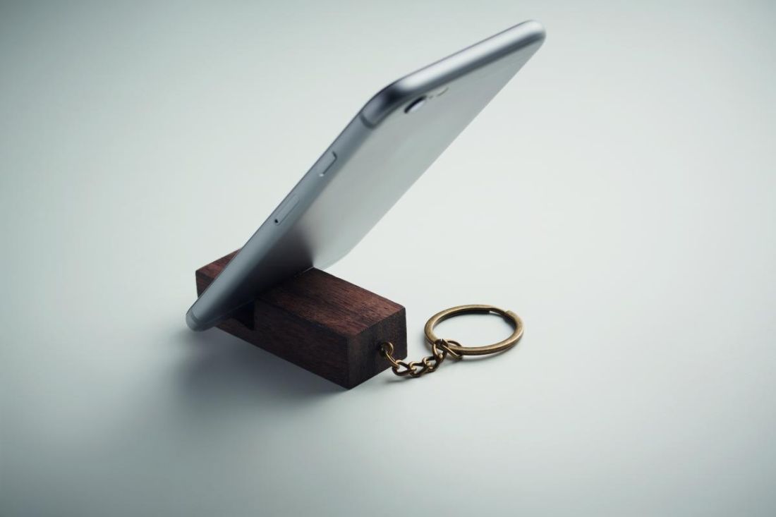 Llavero con soporte para teléfono en madera de nogal.