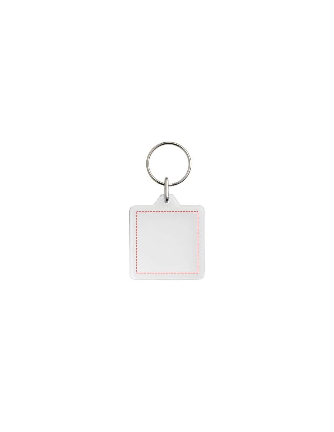 Llavero cuadrado transparente U1 con anilla abierta de metal. La anilla de metal es de perfil plano, ideal para envíos por correo postal. Dimensiones del encarte impreso: 3,2 x 3,2 cm.