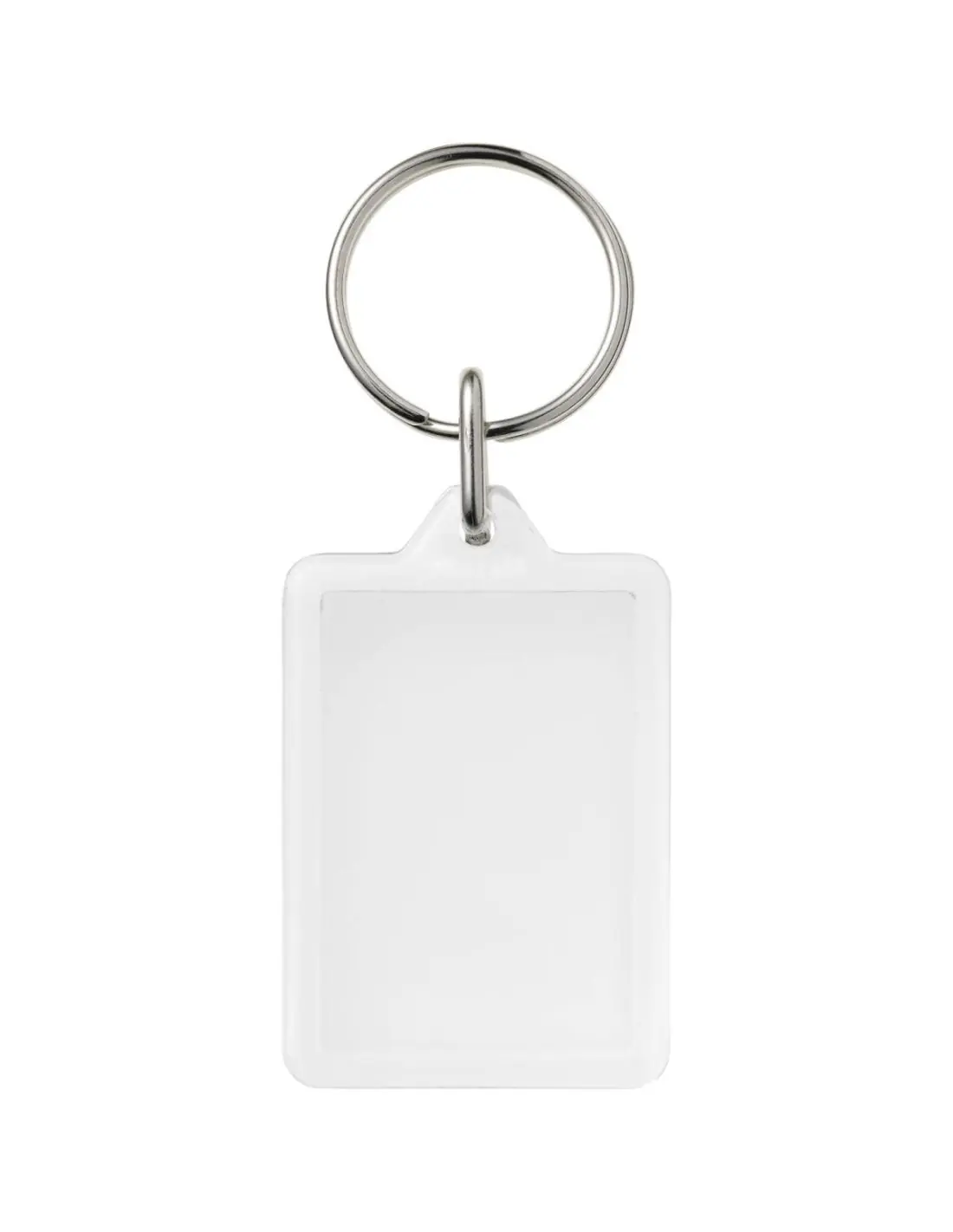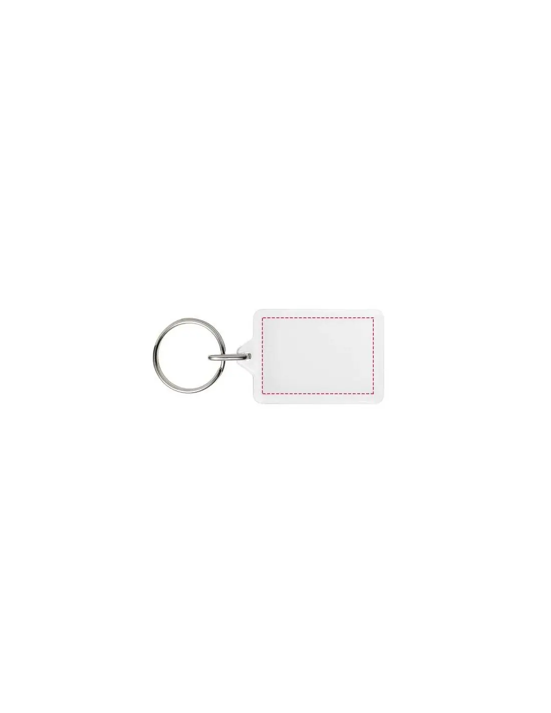 Llavero rectangular transparente Y1 con anilla abierta de metal. La anilla de metal es de perfil plano, ideal para envíos por correo postal. Dimensiones del encarte impreso: 3,5 x 2,4 cm.