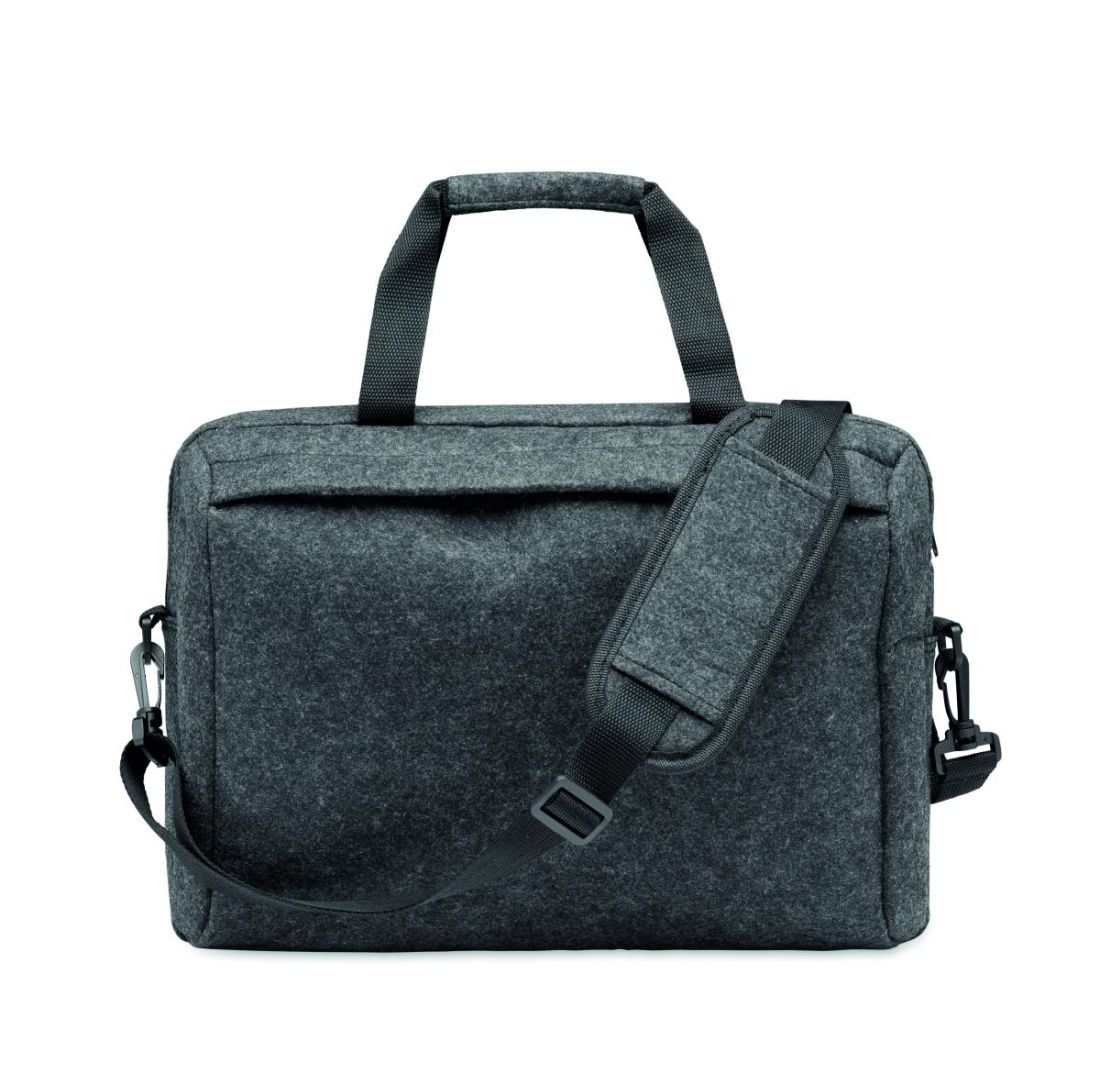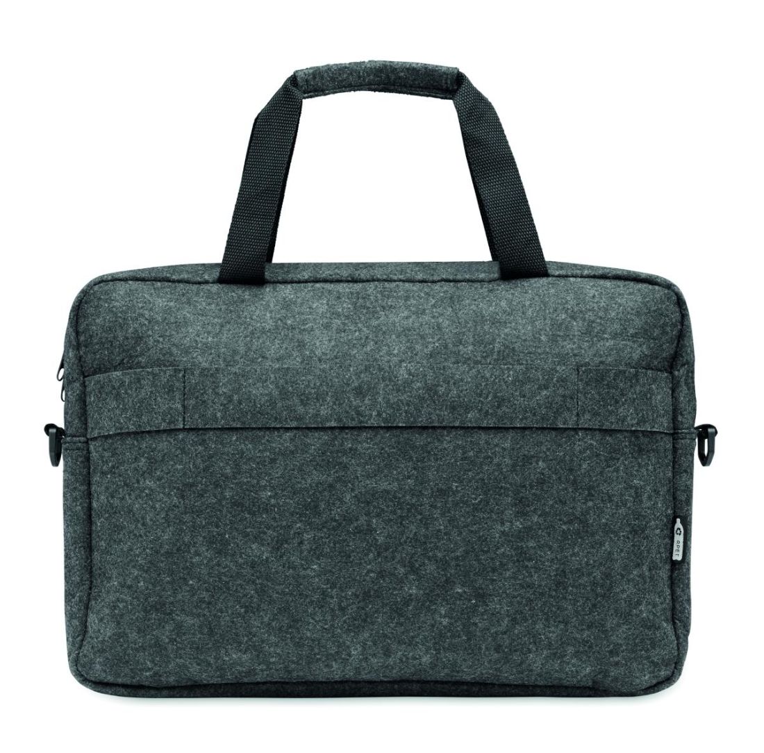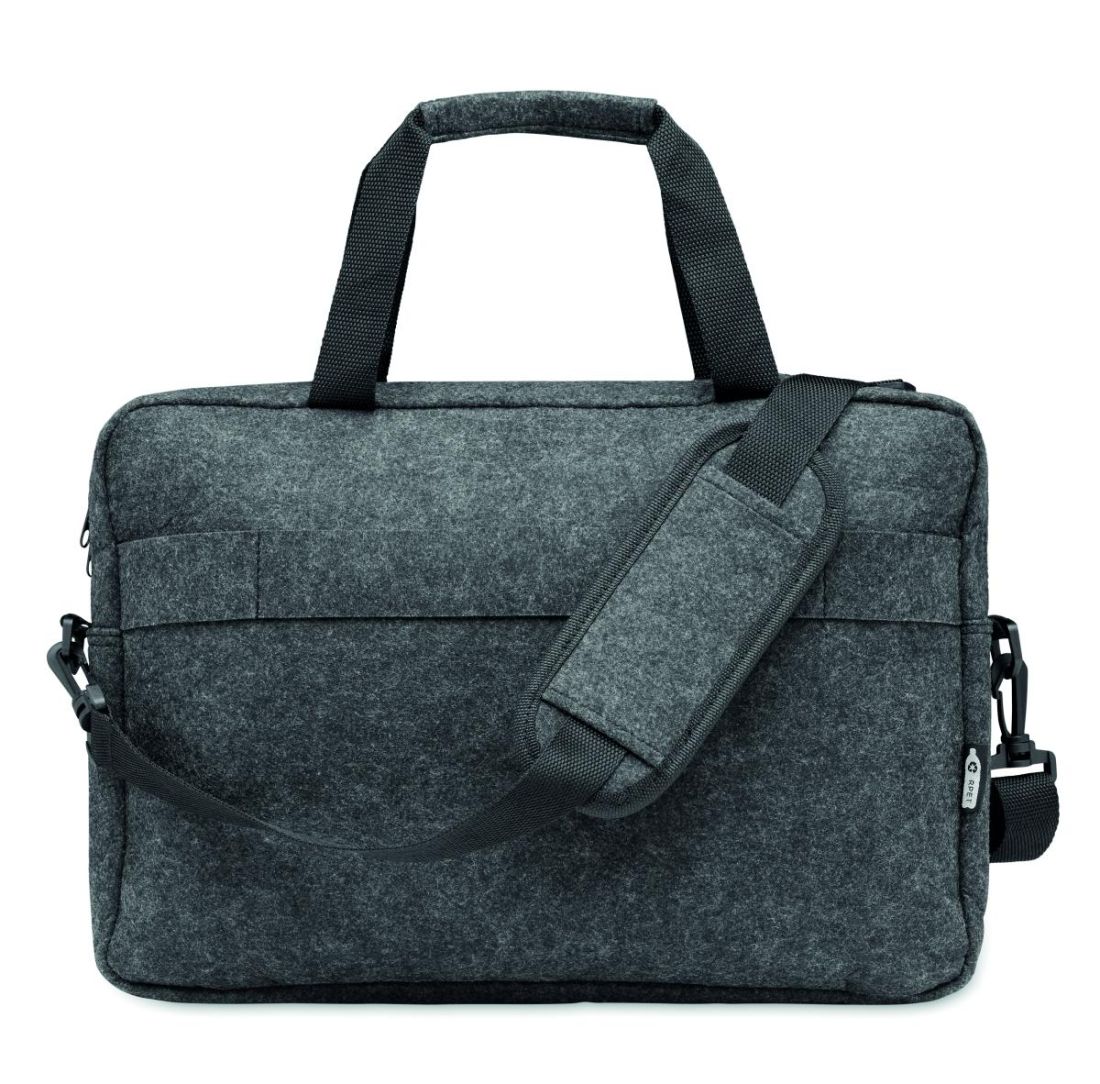 Maletin de fieltro de RPET para portátil de 15'''' que incluye un compartimento interno principal y un bolsillo frontal con cremallera. Incluye correa para el hombro desmontable y ajustable. Sujección para trolley.