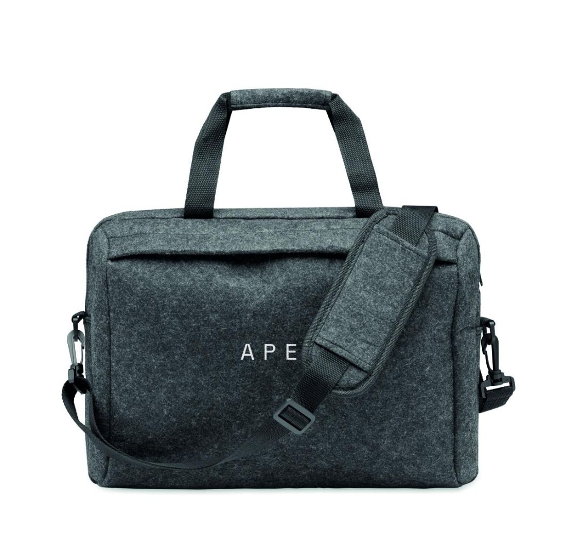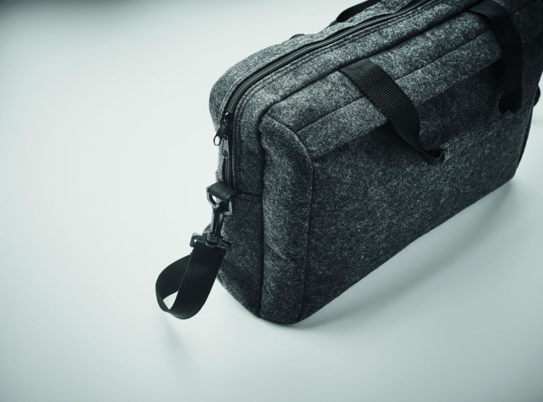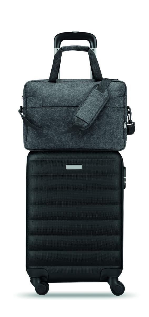 Maletin de fieltro de RPET para portátil de 15'''' que incluye un compartimento interno principal y un bolsillo frontal con cremallera. Incluye correa para el hombro desmontable y ajustable. Sujección para trolley.