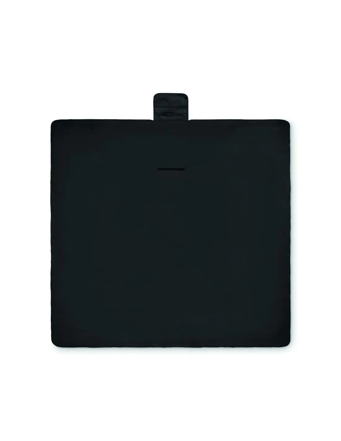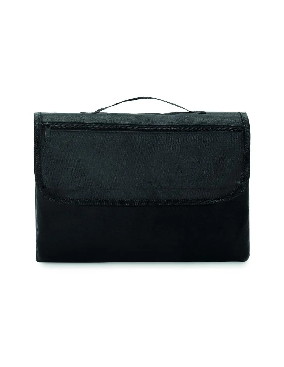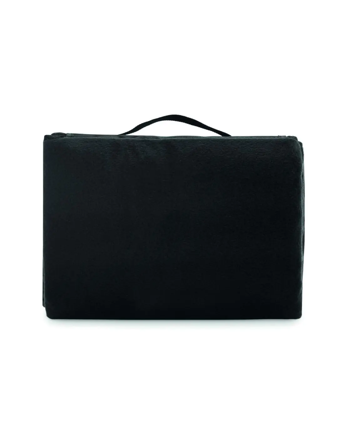 Manta de picnic plegable de forro polar RPET 150 gr/m² (68% poliéster reciclado/32% poliéster normal) con reverso de PEVA revestido resistente al agua. Solapa frontal con bolsillo con cremallera y asa.