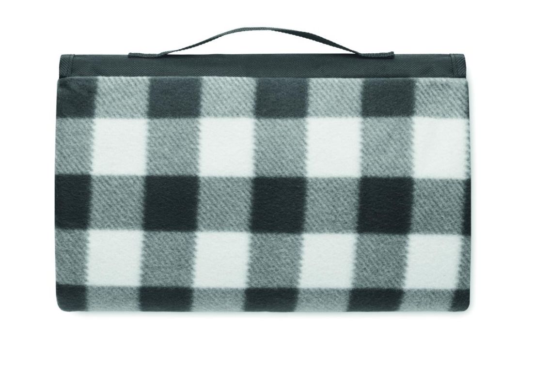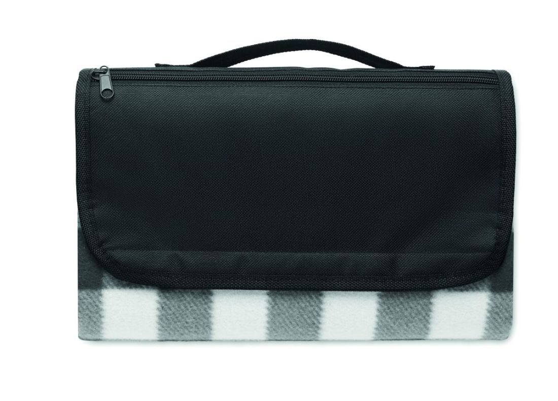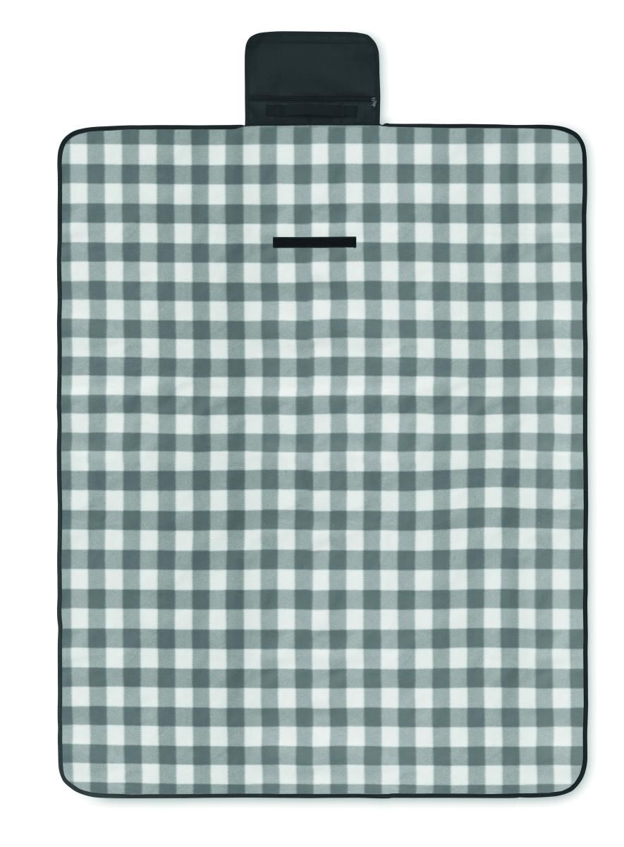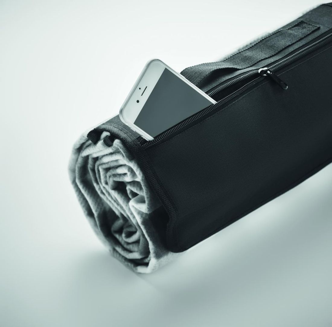 Manta de picnic de RPET 150 gr/m² plegable, de forro polar con reverso de PEVA recubierto resistente al agua. Incluye un bolsillo frontal con cremallera y una cinta bandolera corta.