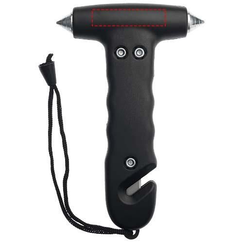 Martillo de emergencia con correa de muñeca y cortacinturones integrado en el mango. Dos rompevidrios de acero endurecido en punta y un cortacinturones para escapar en caso de situaciones de peligro.