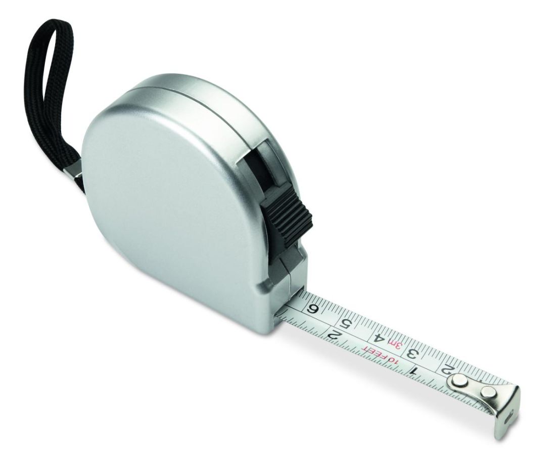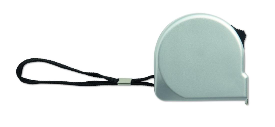 Cinta métrica de 2m en ABS en color plateado mate. Incluye correa de mano para sujetarla y clip de metal plateado.