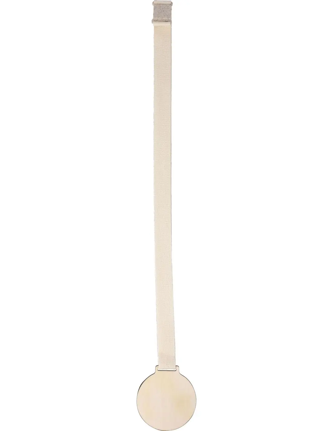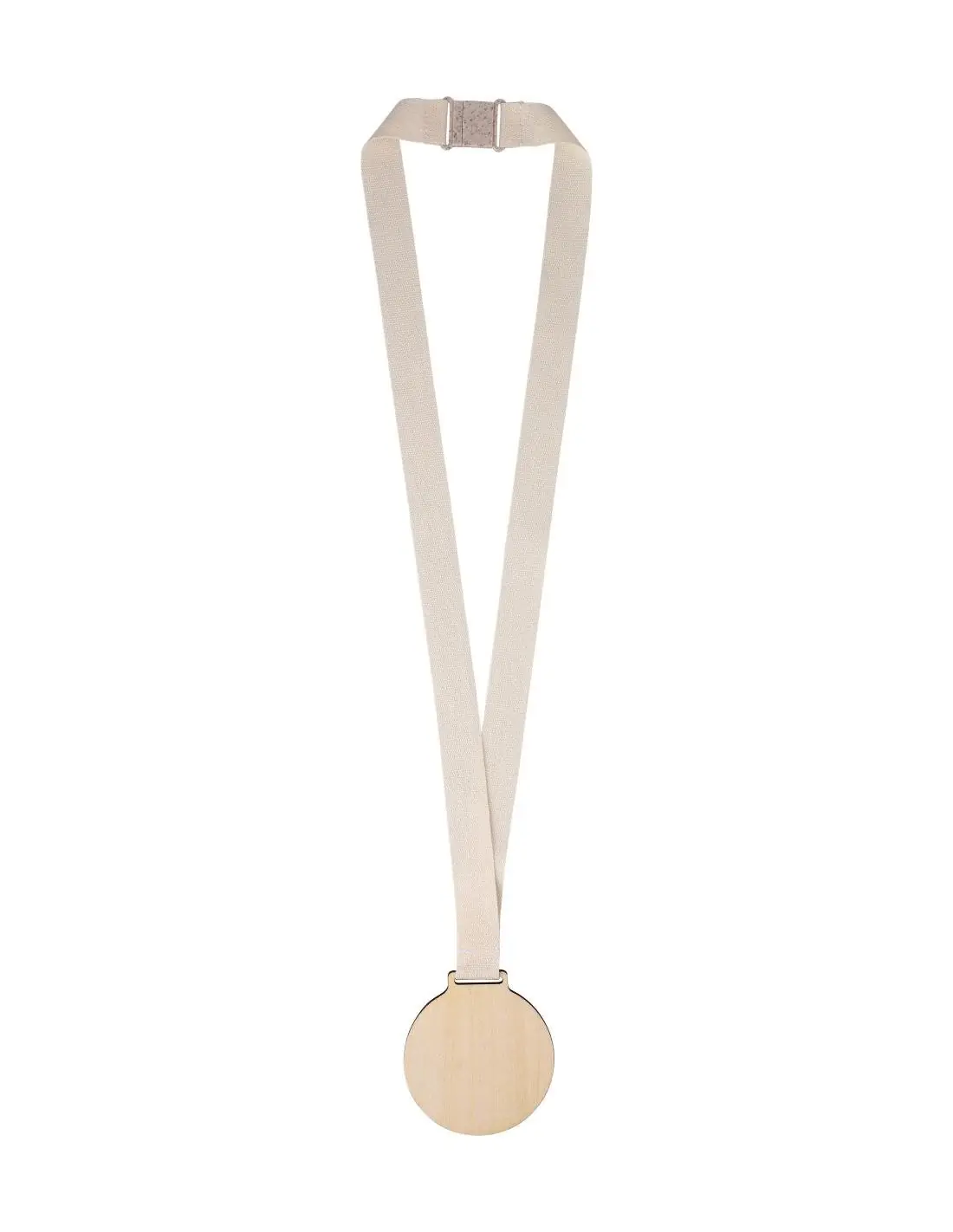 Medalla de madera de tilo de 7 cm de diámetro y 4 mm de grosor, sujeta a un cordón de algodón de 90 x 2 cm. Incorpora una hebilla de seguridad de paja de trigo y PP para mayor comodidad y respeto al medio ambiente.