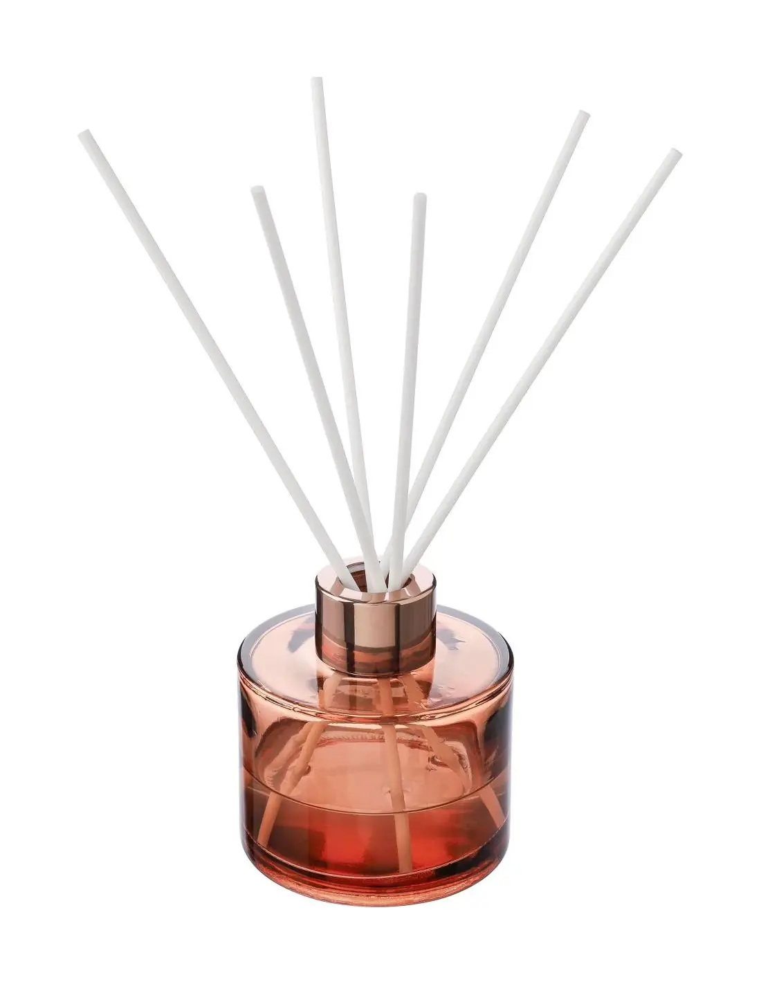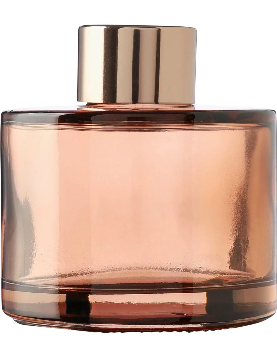Difusor de vidrio (100 ml) con seis varillas de caña. El aroma varía según el color: marrón- pino, transparente-jazmín blanco, azul- océano. Presentado en una caja de cartón marrón.