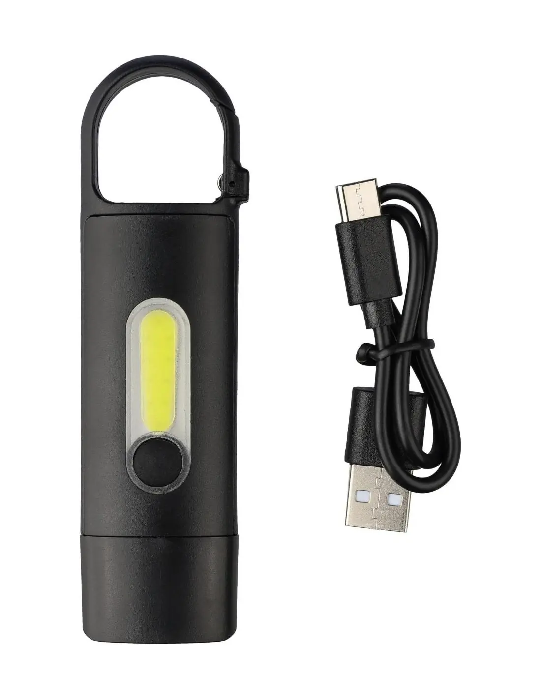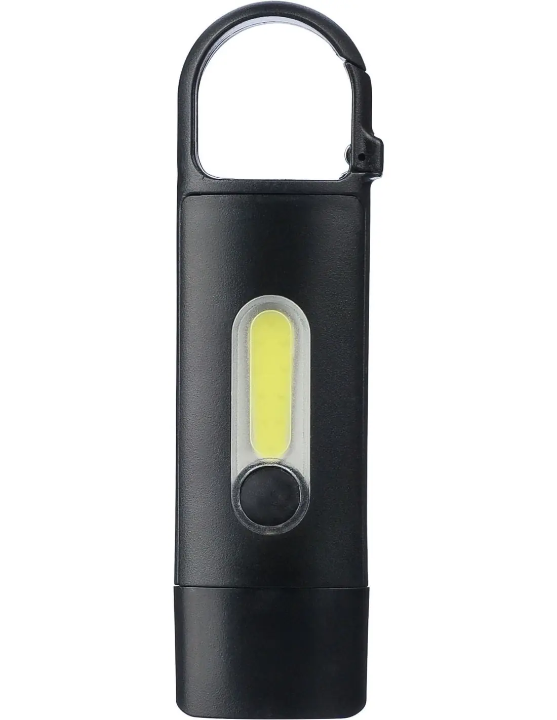 Mini linterna de ABS reciclado con batería integrada de 200 mAh recargable por USB y mosquetón. Cuenta con una luz COB frontal y un reflector COB l…