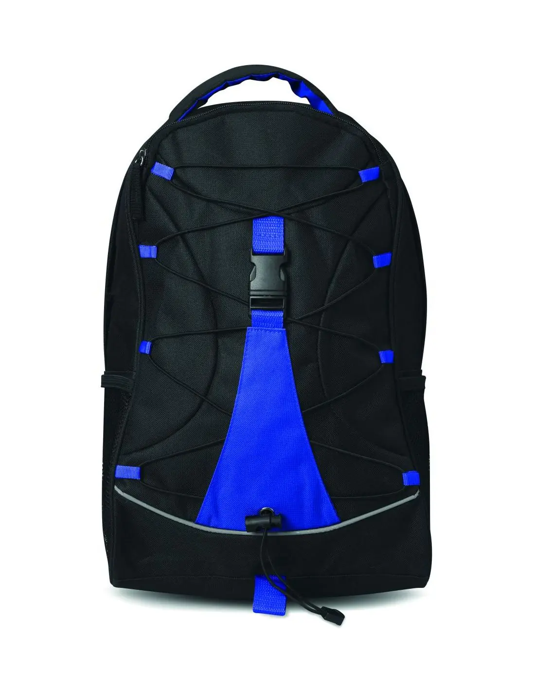 Mochila negra con detalles de color y cuerda decorativa en la parte frontal, realizada en poliéster 600D. Bolsillos de malla laterales.