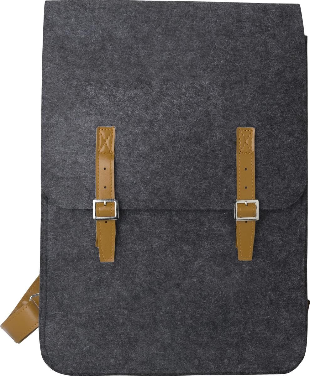Mochila de fieltro rPET con detalles de PU. Un bolsillo grande y otro más pequeño en la parte delantera. Cierre con dos hebillas.