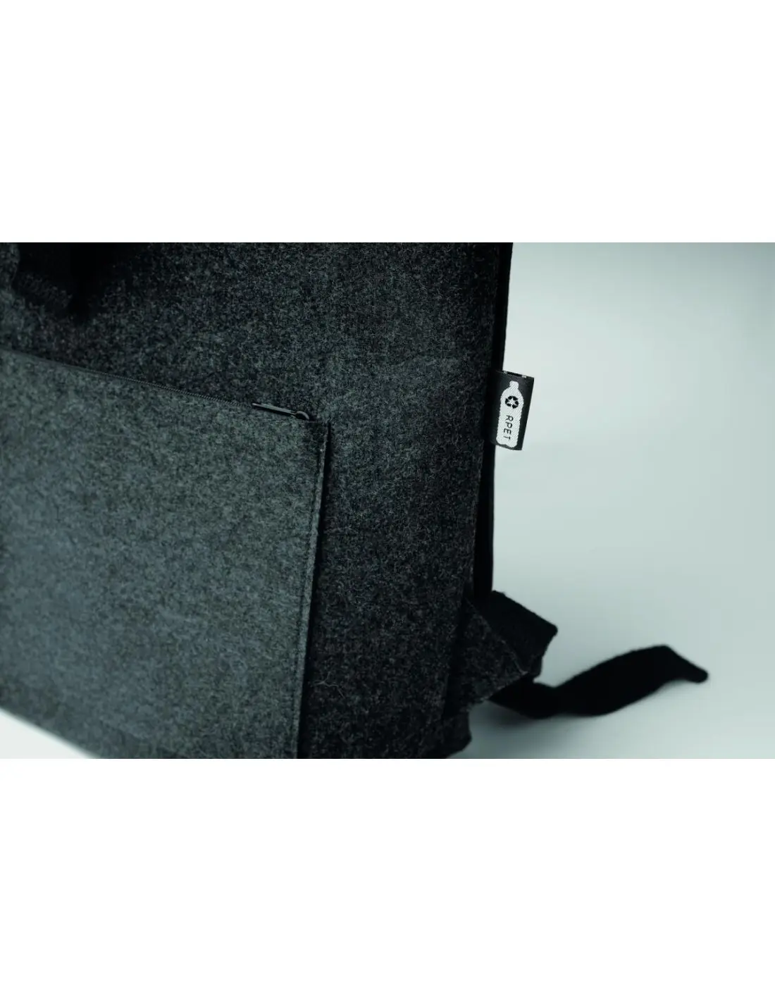 Mochila de fieltro RPET con correa de algodón y bolsillo con cremallera en la parte delantera. Tiene un compartimento para el portátil.