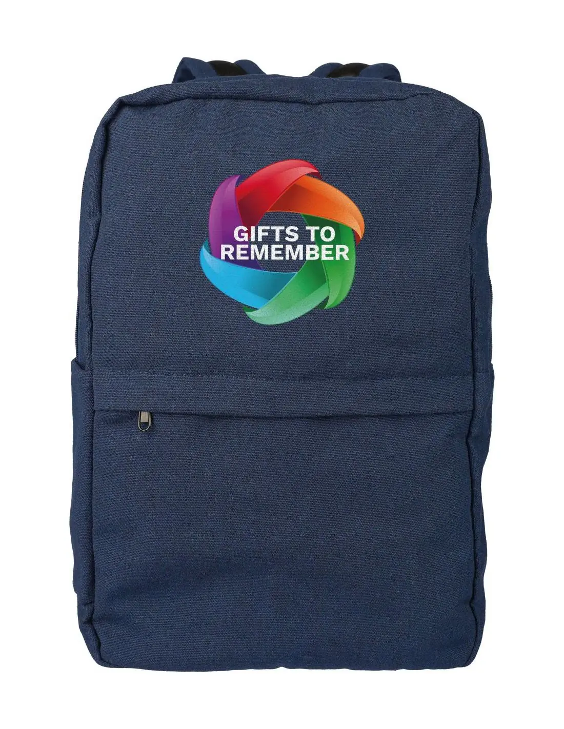 Mochila de polialgodón reciclado (330 g/m2) con forro de poliéster 210D. Cuenta con un amplio compartimento con cremallera, con un espacio acolchado para el portátil (15’’), dos compartimentos interiores y dos exteriores, uno lateral y un pequeño bolsillo frontal con cremallera. El diseño incluye tirantes acolchados ajustables y un asa de transporte. Capacidad: 14L. Capacidad de carga: 13 kg. Incluye una etiqueta indicando que es material reciclado.