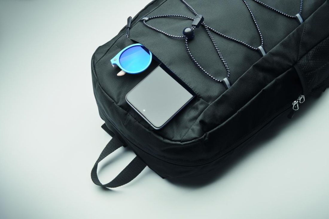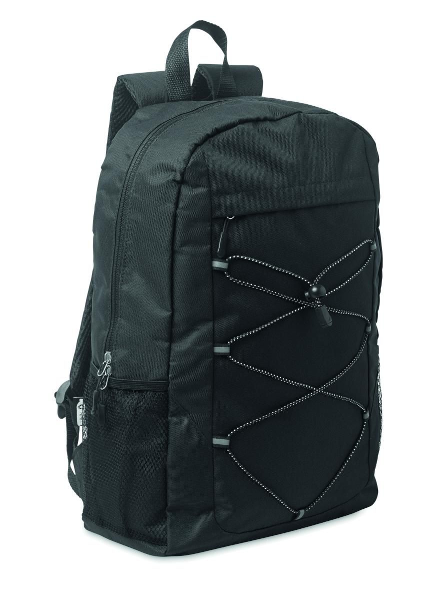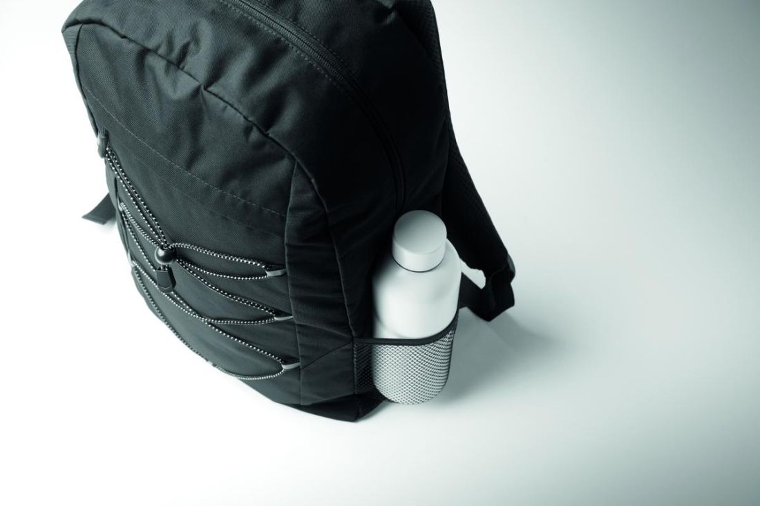 Mochila de poliéster RPET 600D con cordón decorativo y bolsillo frontal con cremallera. Bolsillos de malla en ambos lados.