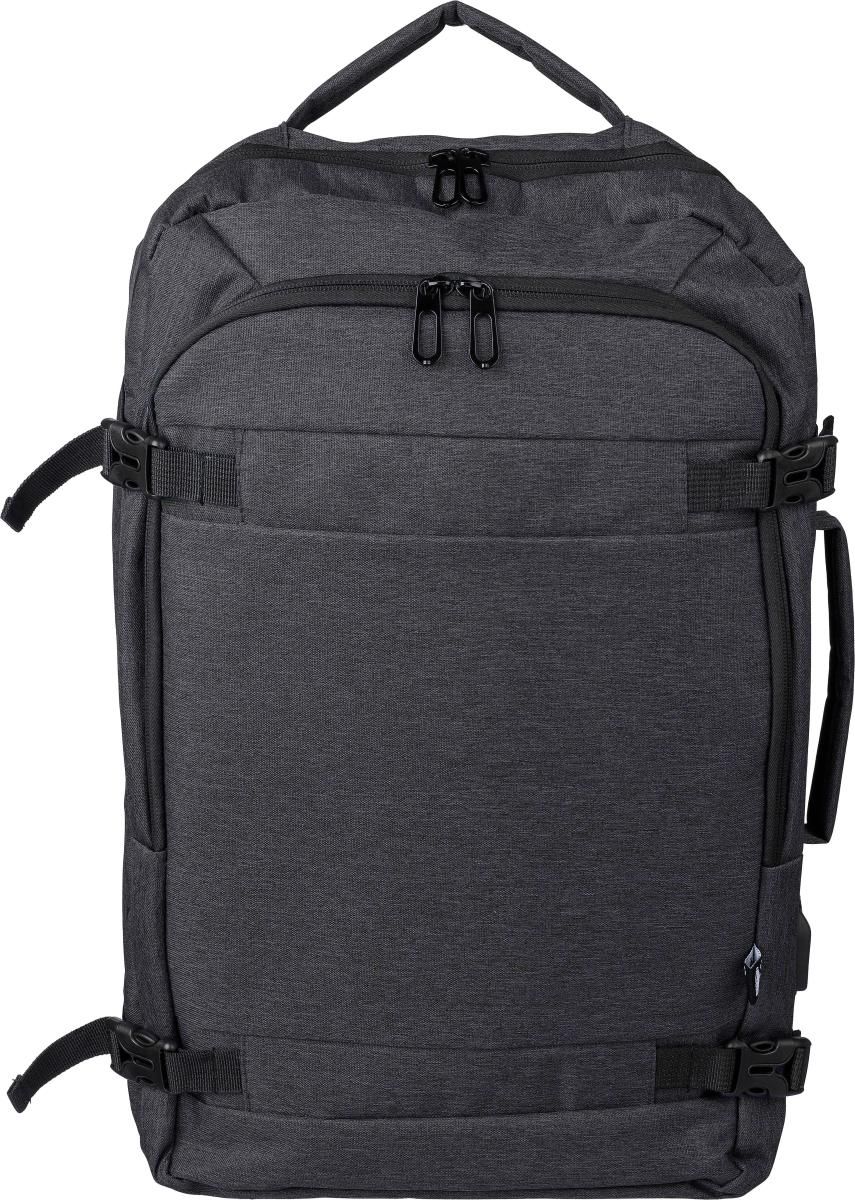 Mochila para portátil (17 '') de poliéster rPET (300D) con forro interior de 210D. Para cabina. Con asa en la parte superior y en los laterales. Compartimento para portátil con velcro, bolsillo antirrobo y dos grandes compartimentos con cremallera. Respaldo acolchado ventilado, correa para el trolley, hebillas de cierre y puerto USB-A en el lateral. Con hebillas laterales para mantener el equipaje compacto. Peso de transporte aprox. 12 kg. Incluye etiqueta rPET.