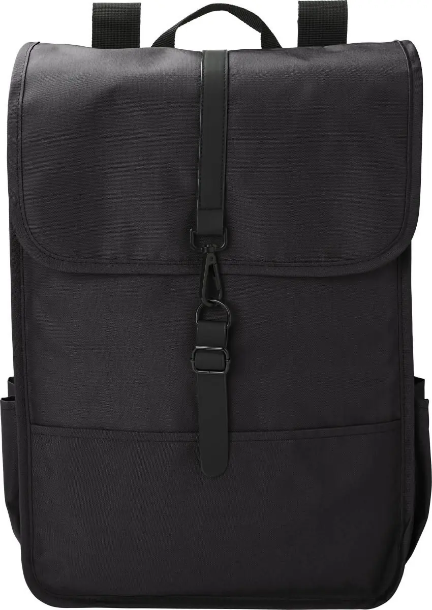 Mochila con solapa de poliéster rPET (300D). Tiene dos bolsillos laterales para botellas y un compartimento grande. Con correa de PU negra y hebilla.