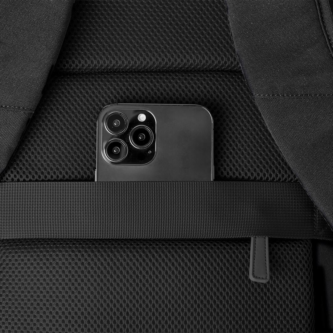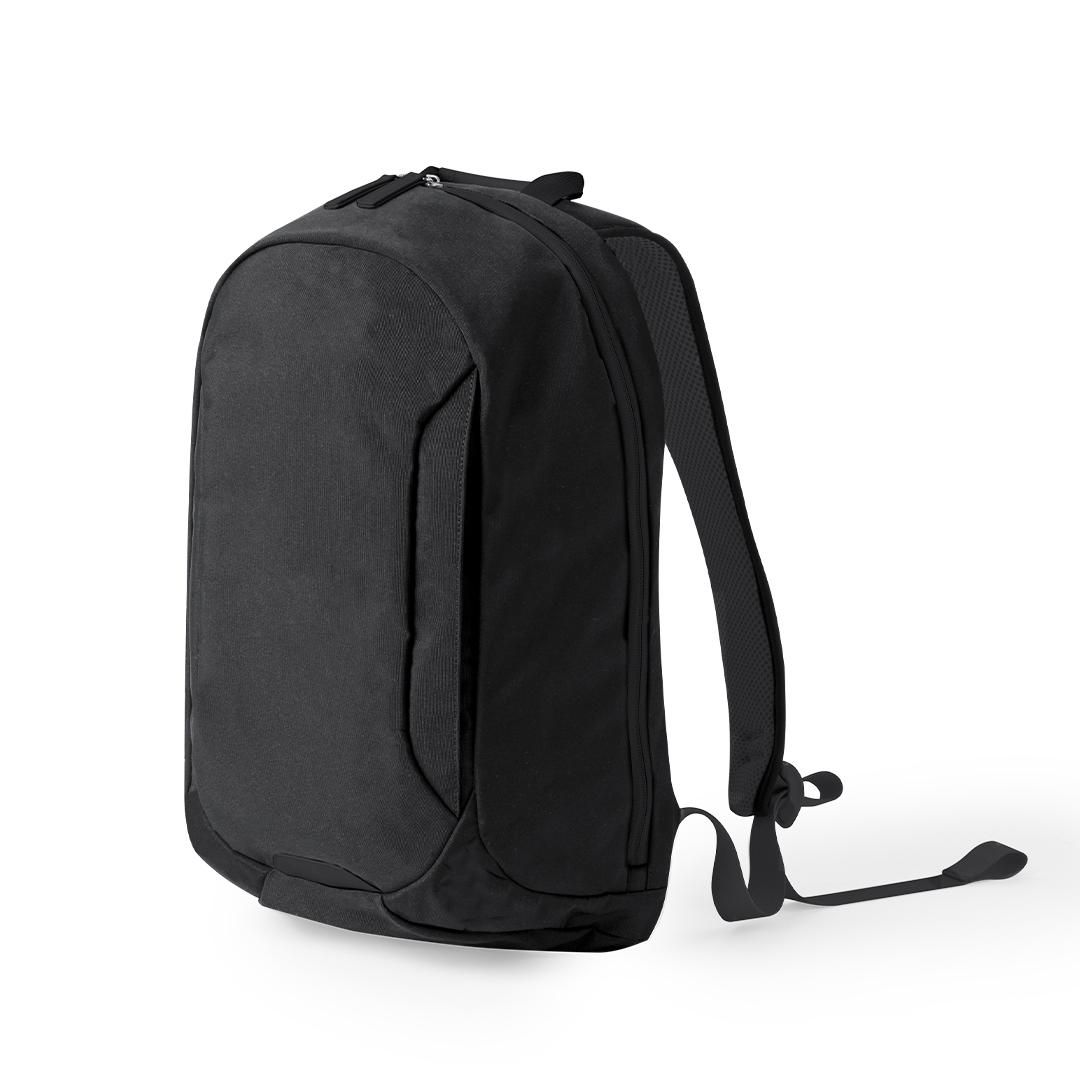 Mochila fabricada en resistente poliéster, dotada de cierre de cremallera de doble tirador y un bolsillo frontal. En su interior, dispone de compartimento acolchado para portátil hasta 15 pulgadas y compartimento para tablet de hasta 10 pulgadas. En el exterior, cuenta con un bolsillo frontal de acceso rápido y otro oculto en la espalda acolchada para guardar objetos de valor, incorporando una cinta para fijarla a las maletas. Sus esquinas reforzadas aportan durabilidad, e incluye asa de transporte, con elegantes accesorios en tono negro. Las cintas de hombros y la espalda son acolchadas y ajustables para mayor comodidad. Presentado en una bolsa individual reciclada.