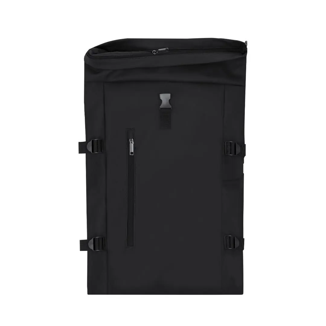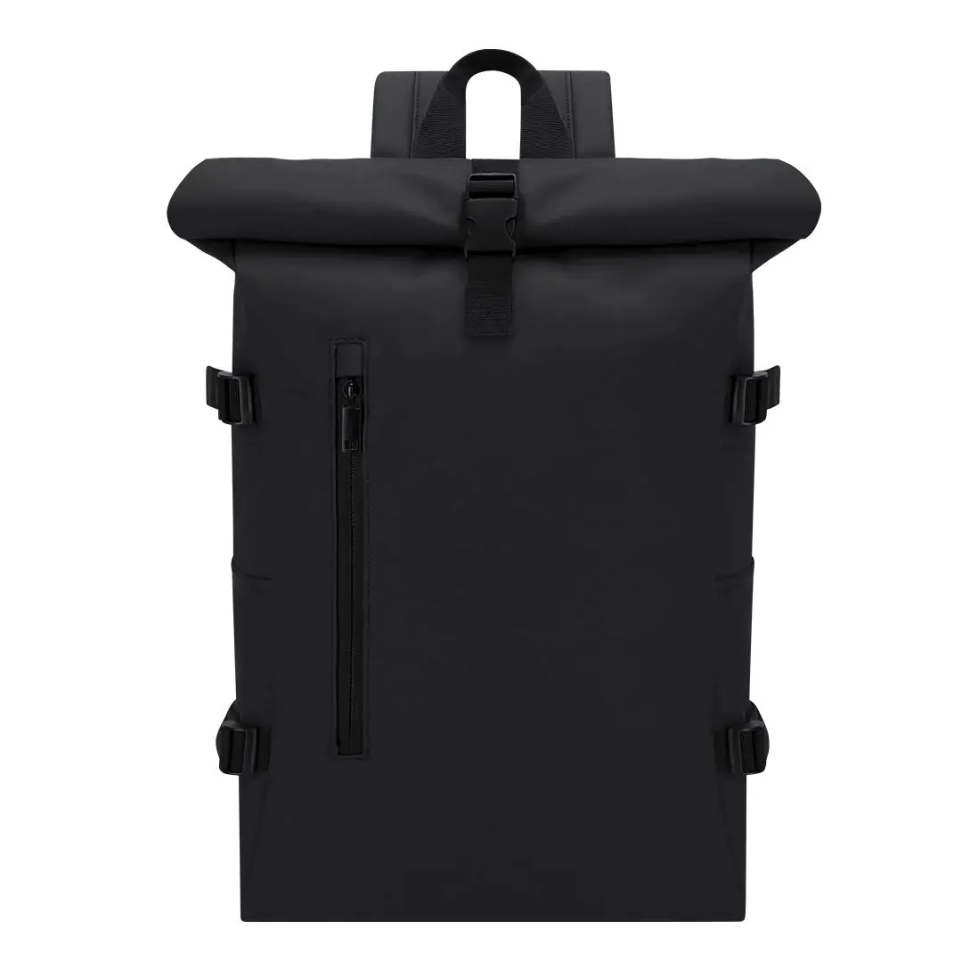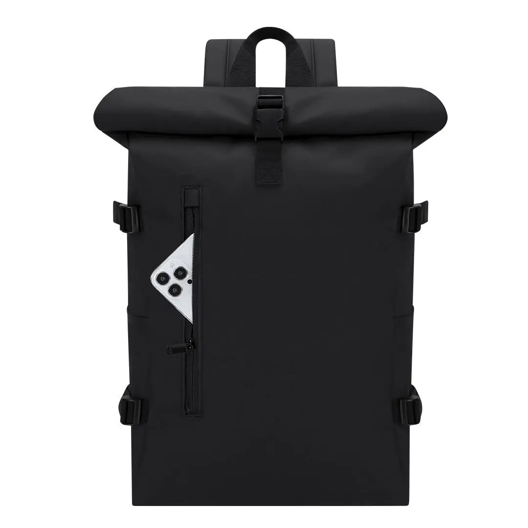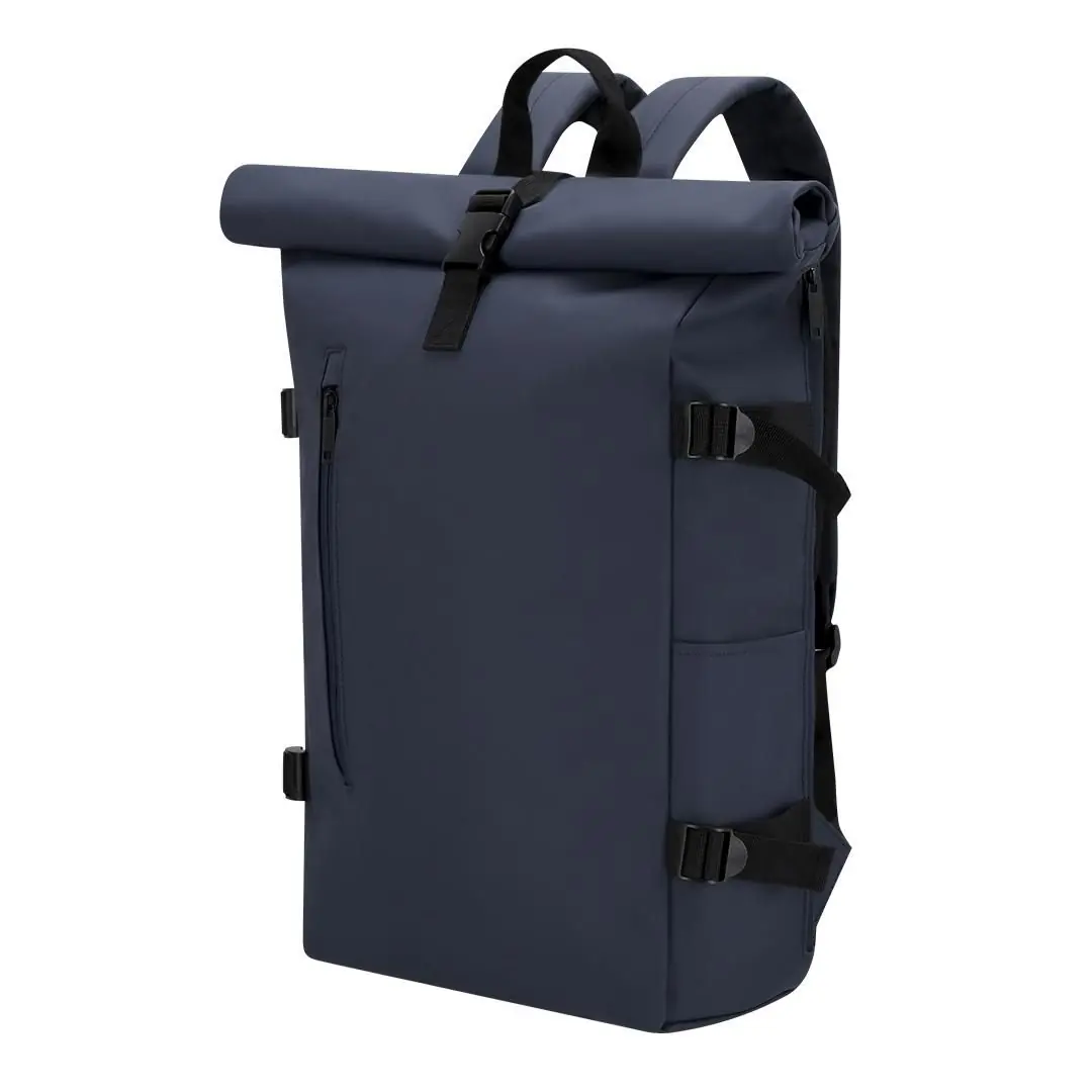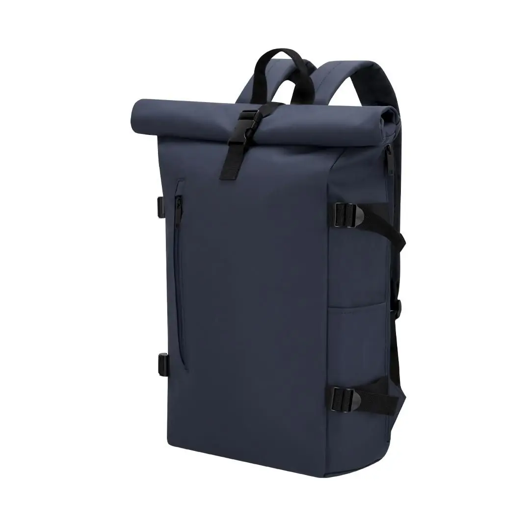 Mochila confeccionada en suave PU con sistema de cierre enrollable con cremallera y hebilla. Dispone de un bolsillo frontal y un bolsillo trasero con acceso lateral, ambos con cremalleras de cierre invisible y dos bolsillos laterales adicionales. Interior de gran capacidad con compartimento acolchado para portátil de hasta 15 pulgadas. Cintas laterales ajustables que permiten compactar el volumen según necesidad. Cintas de hombros en PU y espalda acolchadas para mayor comodidad. Cuenta con correa pectoral con hebilla para un ajuste seguro. Incluye cinta trasera para ajuste en trolley o maleta, ideal para viajes y desplazamientos.