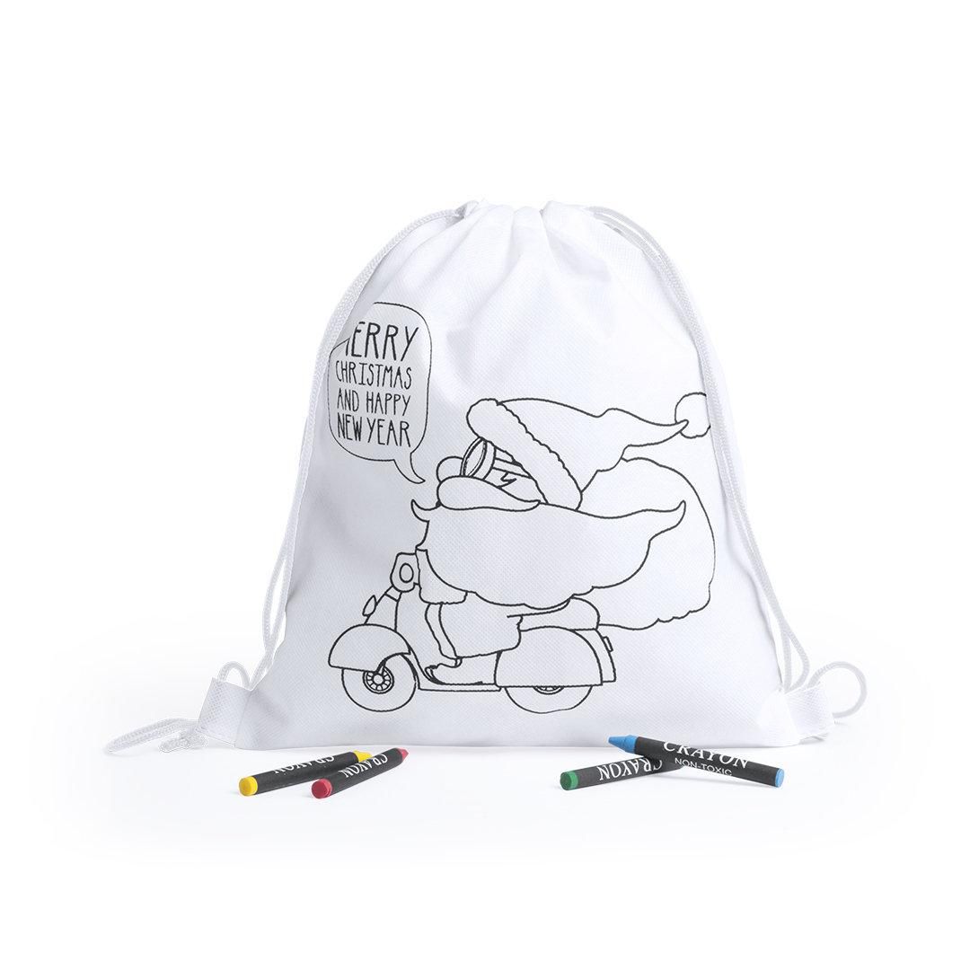 Mochila navideña infantil de non-woven en color blanco especialmente diseñada para colorear con ceras. Incluye 4 ceras en variados colores. Con cuerdas autocierre a juego y refuerzos en las esquinas. Disponible en diseños Merry Xmas y Papá Noel.