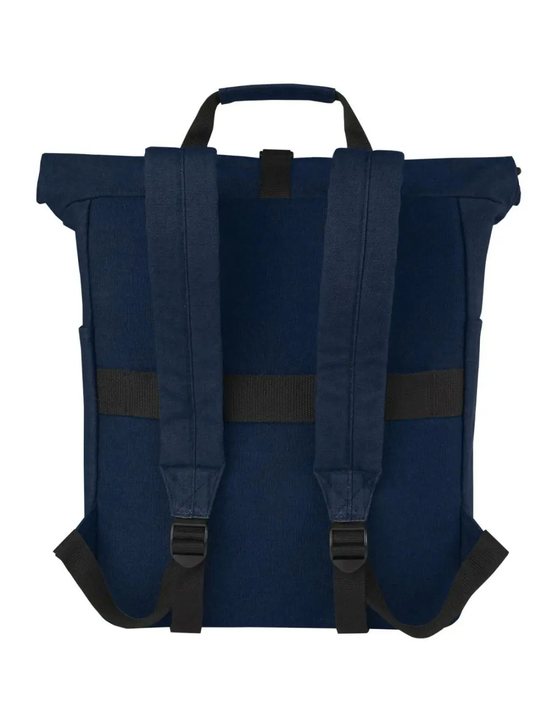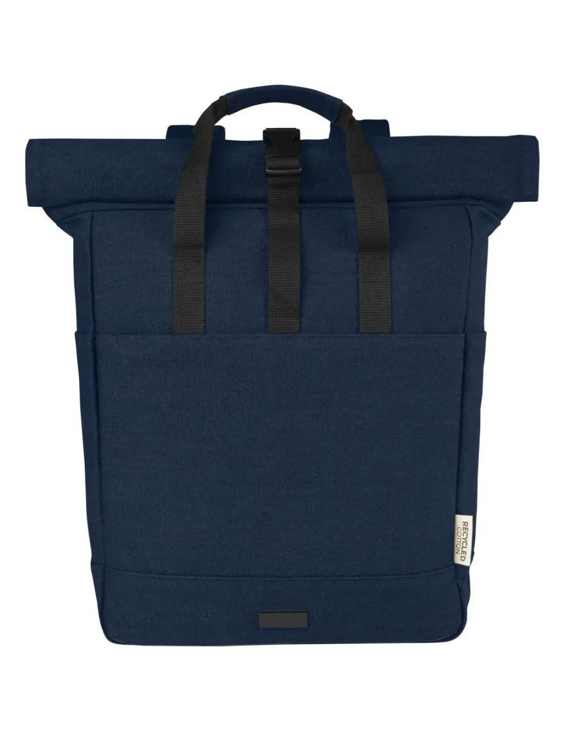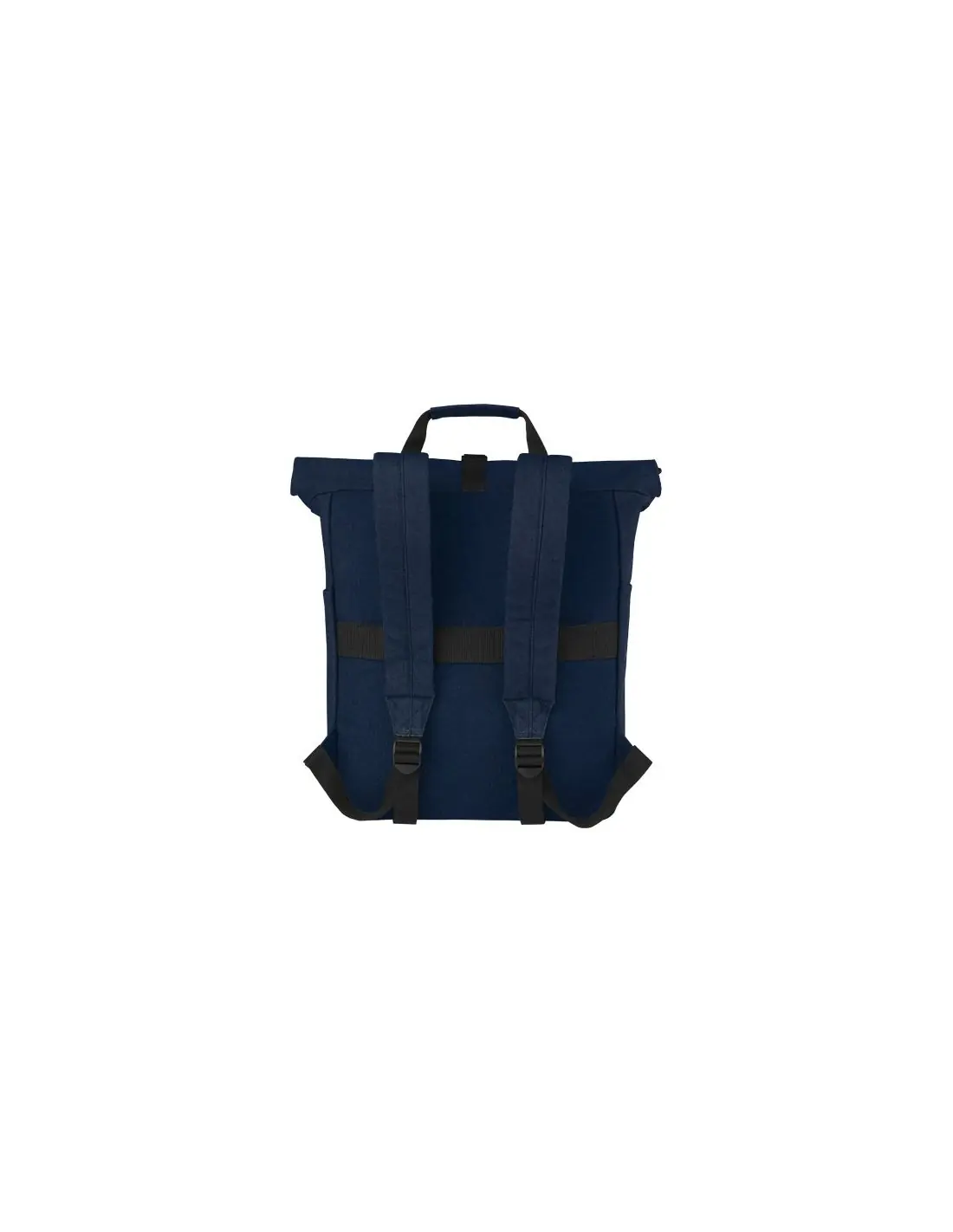 Compuesta por lona reciclada GRS y forro GRS RPET, la mochila enrollable de inspiración retail cuenta con una funda específica para tableta y un compartimento acolchado para portátil de 15". La mochila también tiene 2 bolsillos laterales para agua y un bolsillo delantero grande con cremallera, así como una abertura superior enrollable con cremallera para el máximo almacenamiento y seguridad. Las 2 asas de correa reforzadas hacen que sea fácil y cómoda de llevar como un bolso de negocios. La placa metálica decorativa puede hacer brillar un logotipo gracias a su acabado sutil y mate.