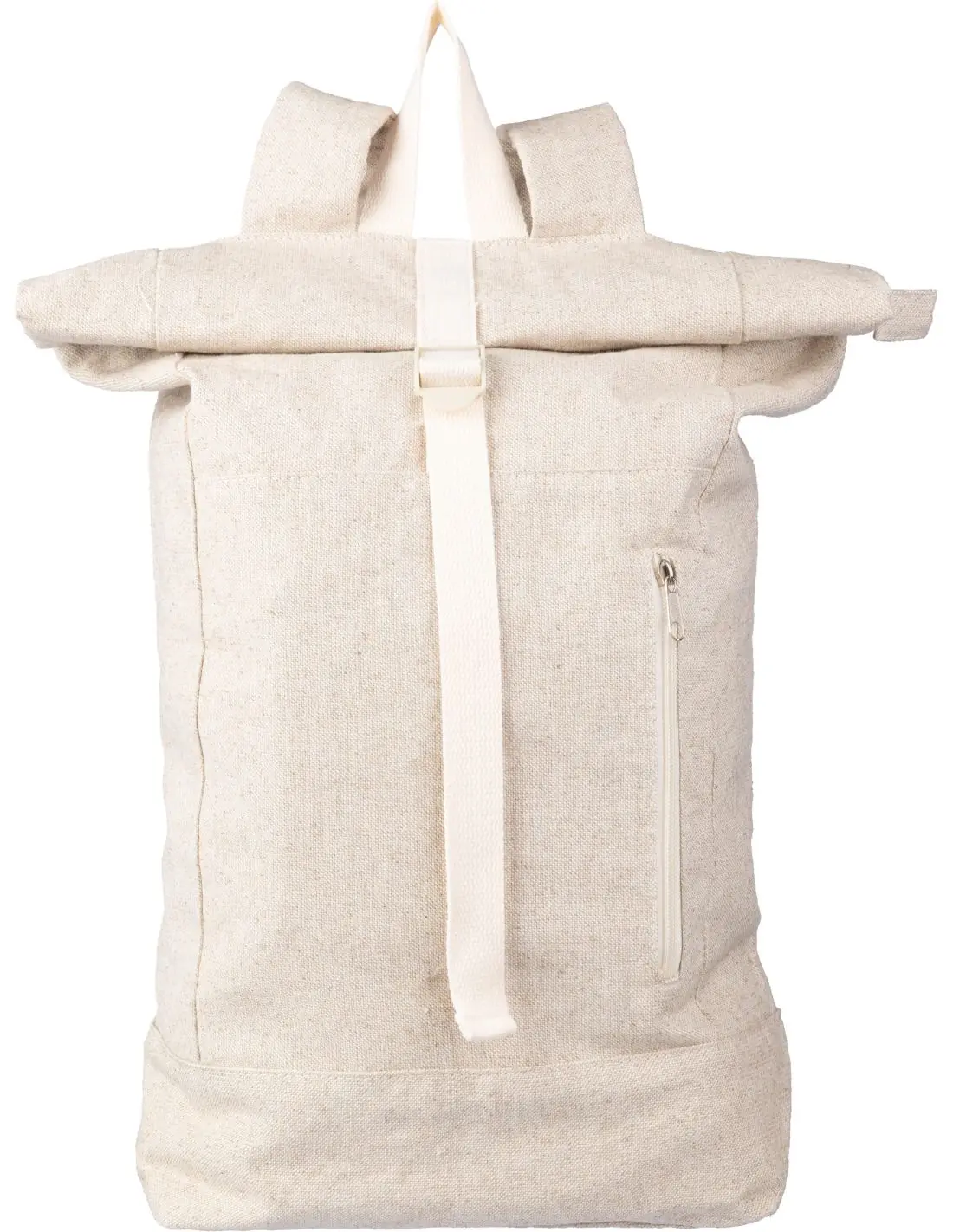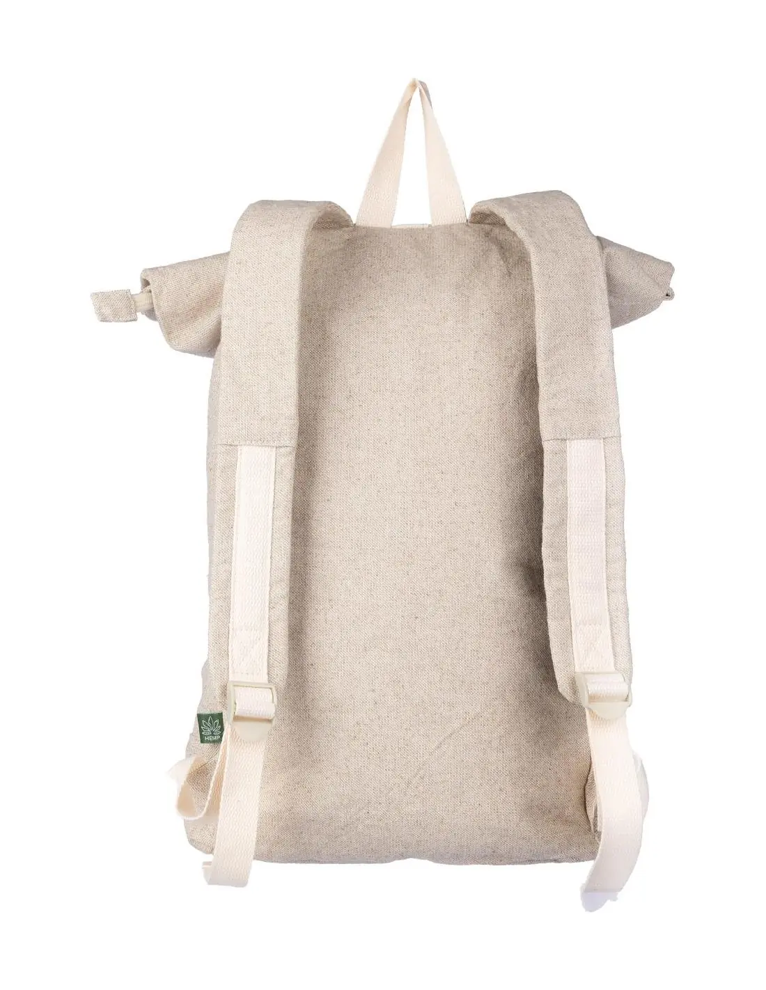 Mochila enrollable de cáñamo (280 g/m²) con forro de algodón. Incluye el logotipo de cáñamo en la etiqueta.