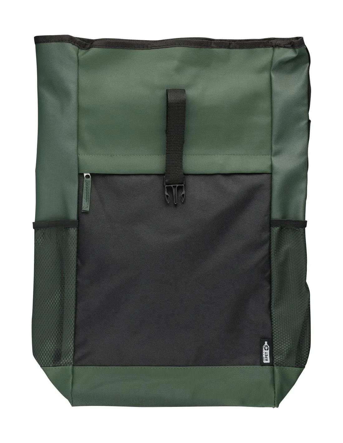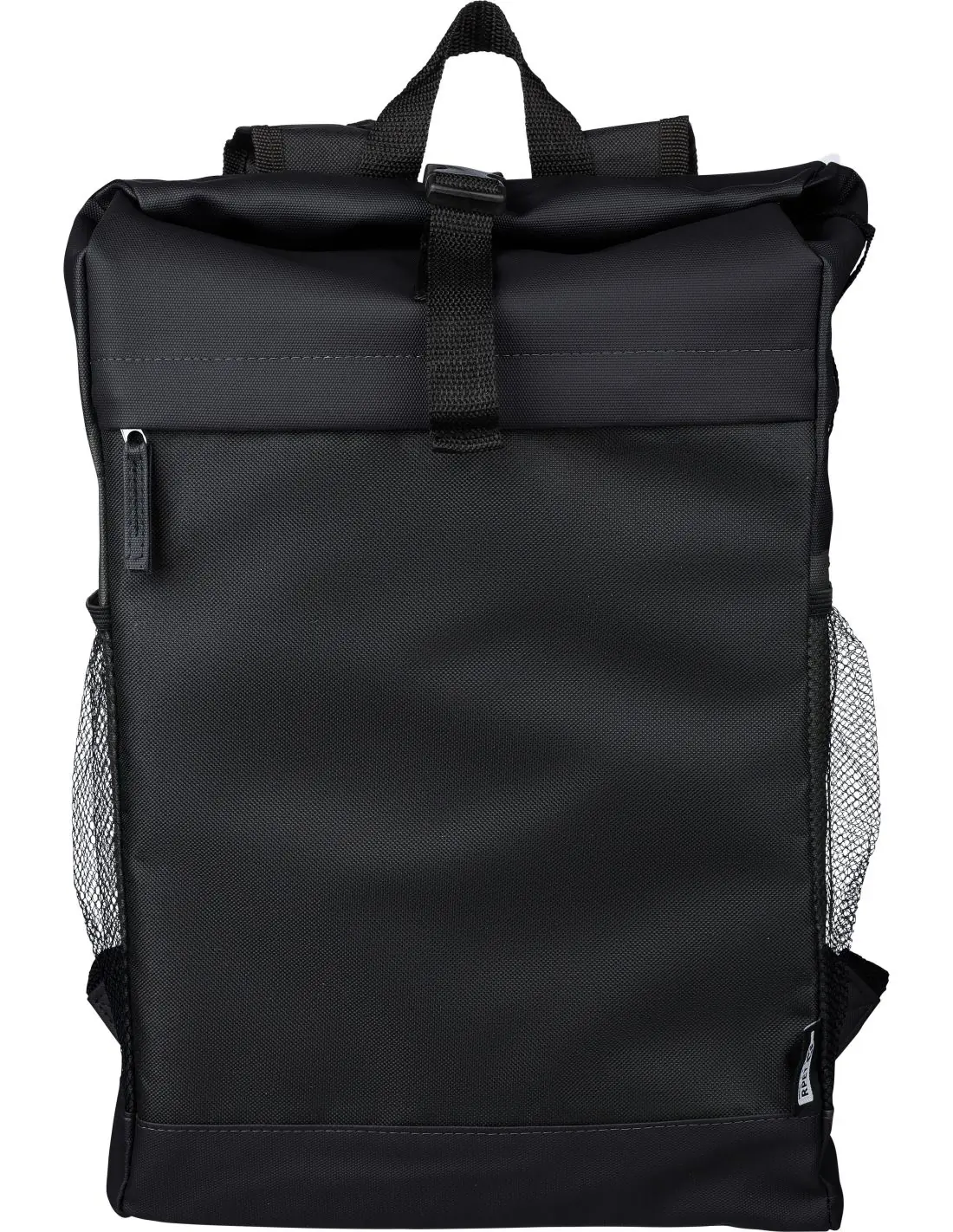 Mochila enrollable de poliéster rPET (600D) con revestimiento de PU para repeler el agua. Cuenta con un bolsillo frontal oculto con cremallera, una funda acolchada para portátil (compatible con portátiles de hasta 15 pulgadas), bolsillos laterales de malla y cinco compartimentos, incluyendo uno interior y uno frontal. Diseñada con correas de transporte ajustables y cierre adhesivo enrollable. Ofrece una capacidad de 25 litros y una capacidad de carga de 15 kg. Incluye una etiqueta de rPET en el lateral y una etiqueta personalizada en el interior.