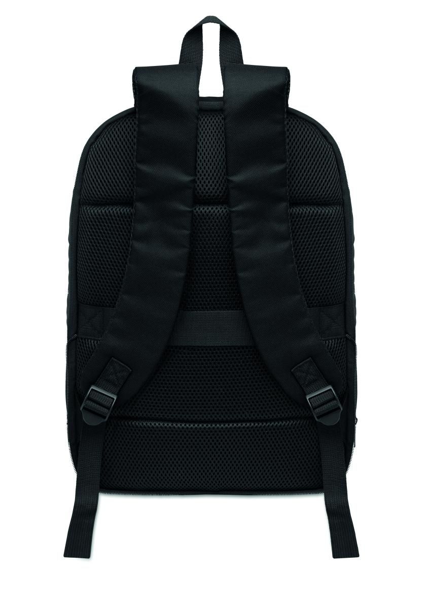 Mochila expandible de RPET 600D para ordenador de 16'' con revestimiento de PU en la parte delantera y forro de poliéster RPET. Bolsillo oculto con cremallera y compartimento acolchado para portátil, compartimento frontal , parte trasera de malla y correa para equipaje.