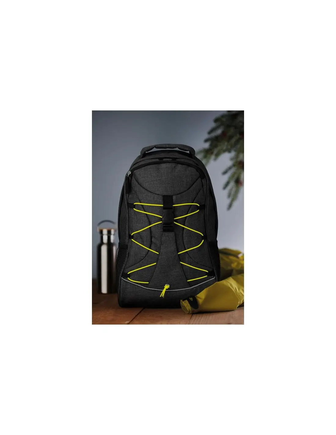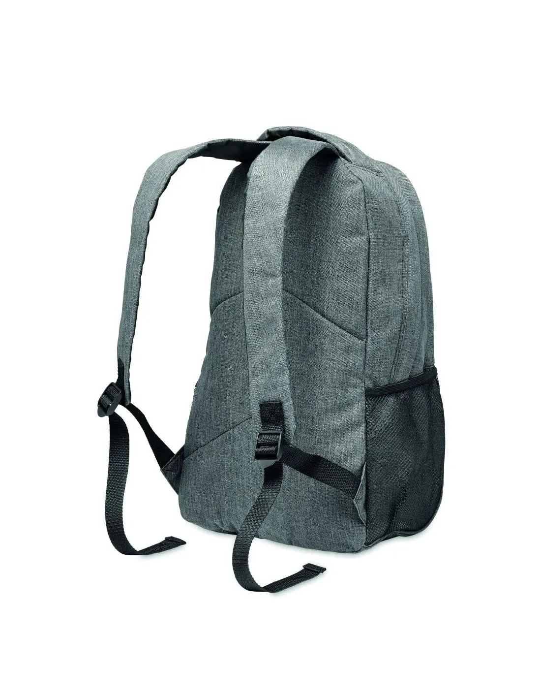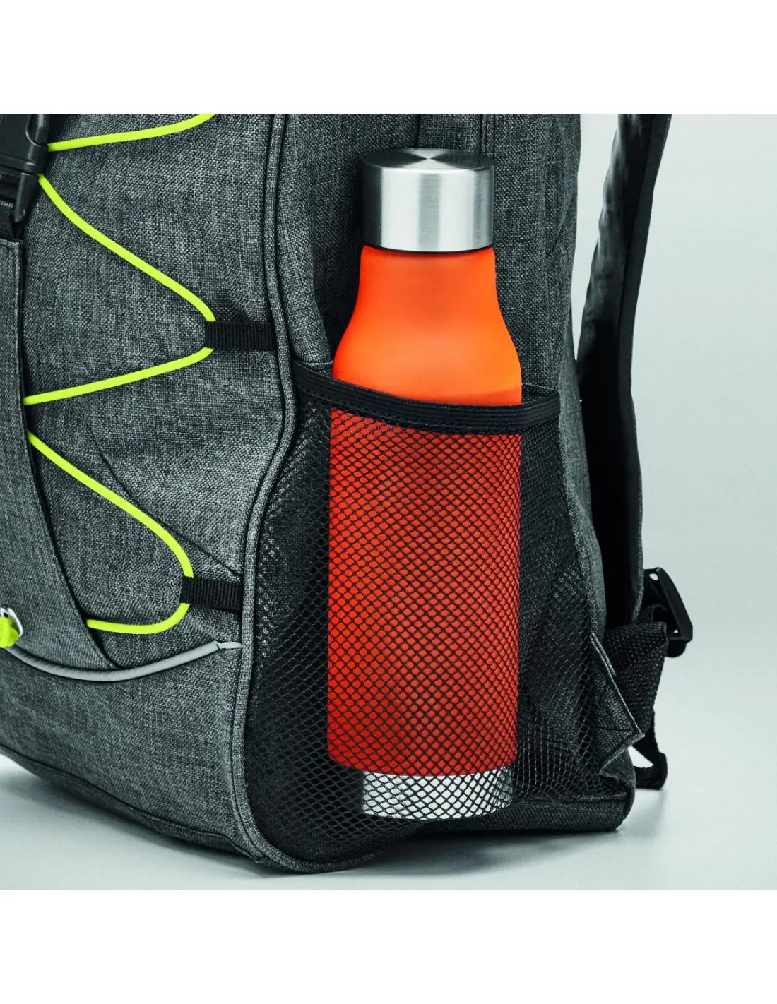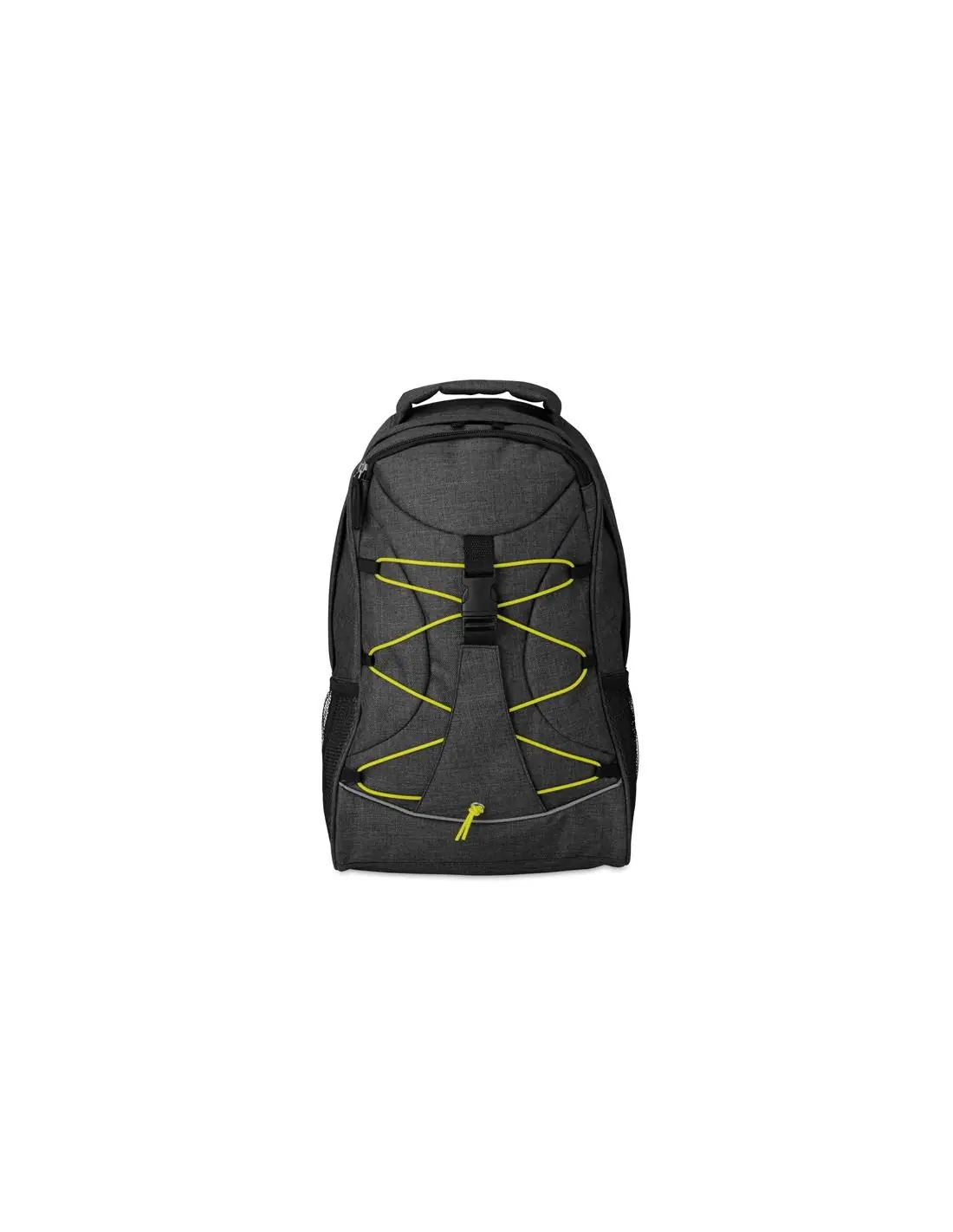 Mochila de poliéster 600D jaspeada con revestimiento de colores contrastantes y cordón decorativo en la parte frontal. Bolsillos de malla en ambos lados.