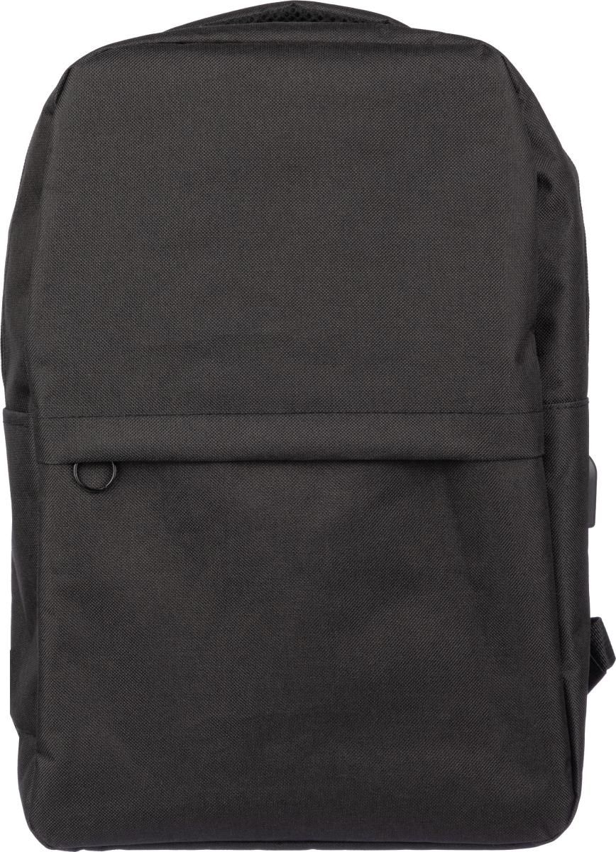 Mochila de rPET (600D) con puerto USB (y cable USB en el interior). Tiene un gran compartimento con cremallera en la parte superior y un bolsillo con cremallera en la parte delantera. En el interior, hay un compartimento para dispositivos de 10’’ y otro para dispositivos de 15’’. Correas ajustables.