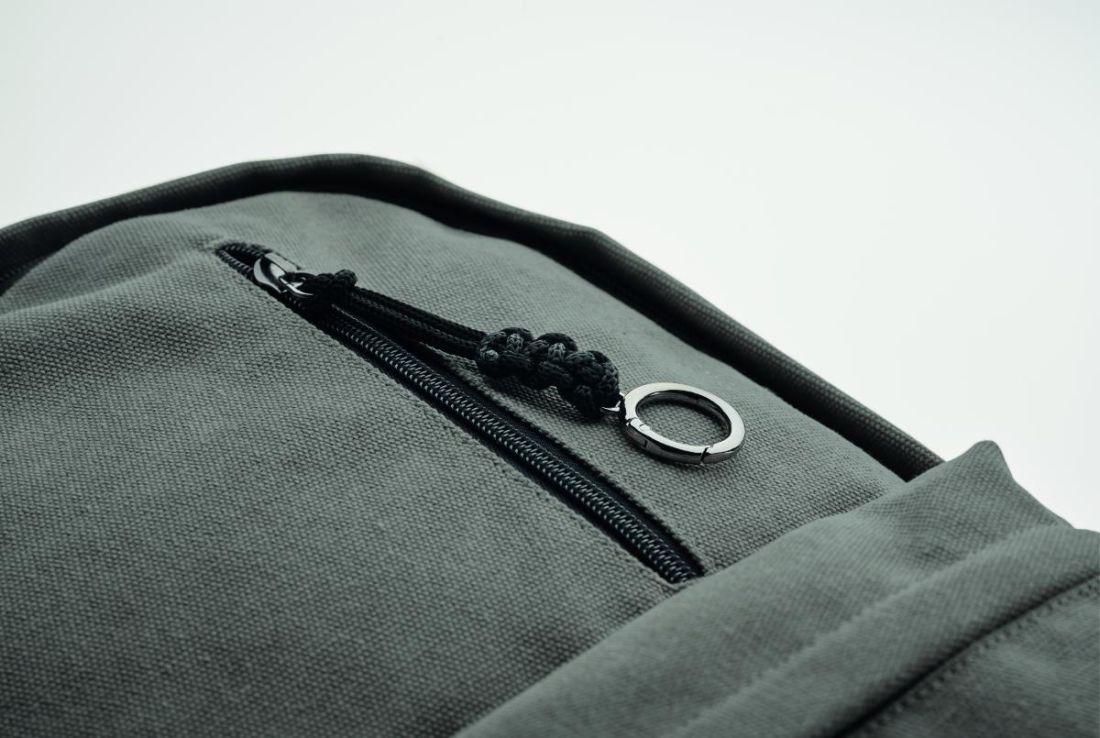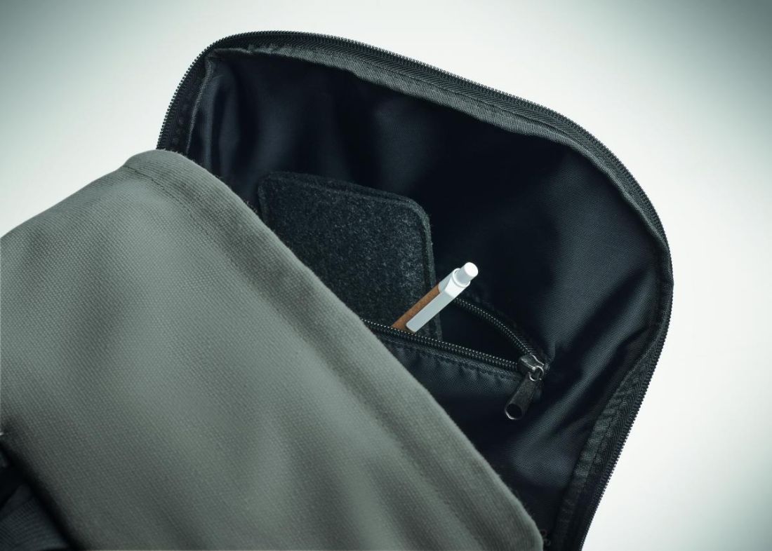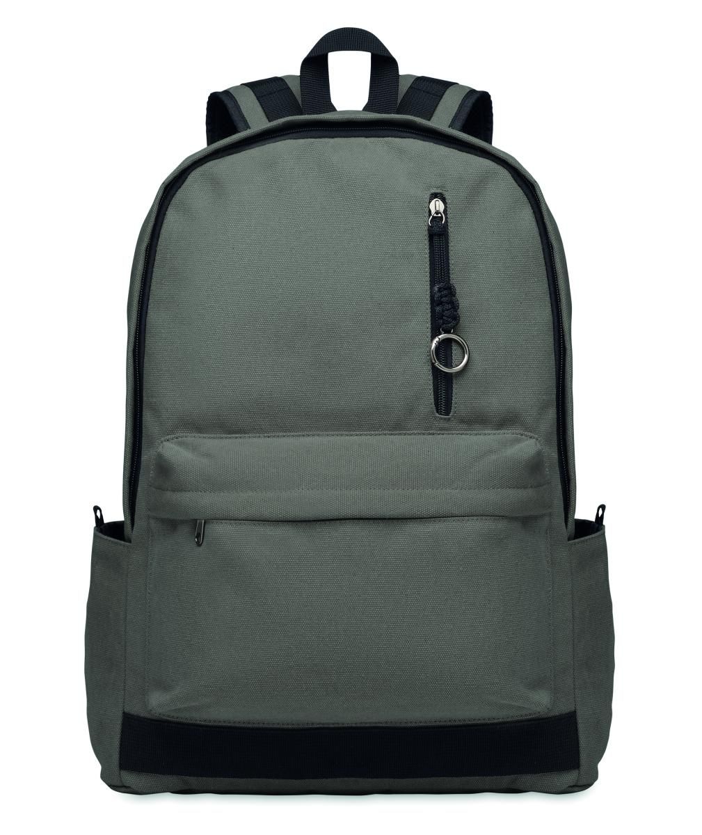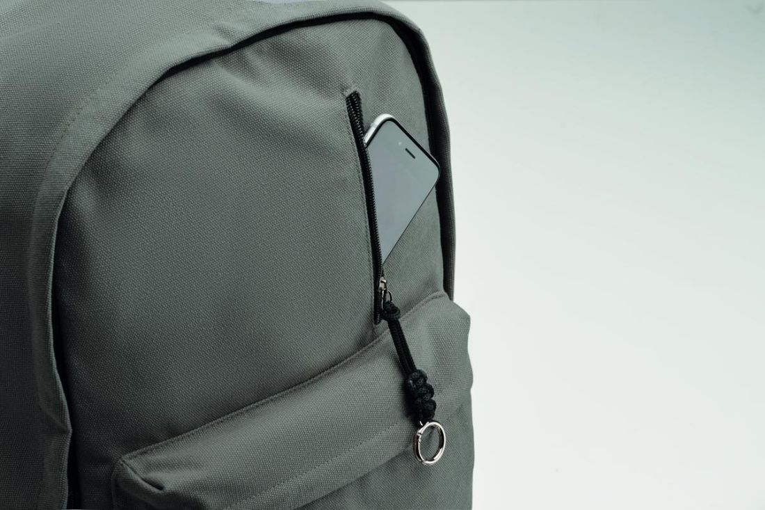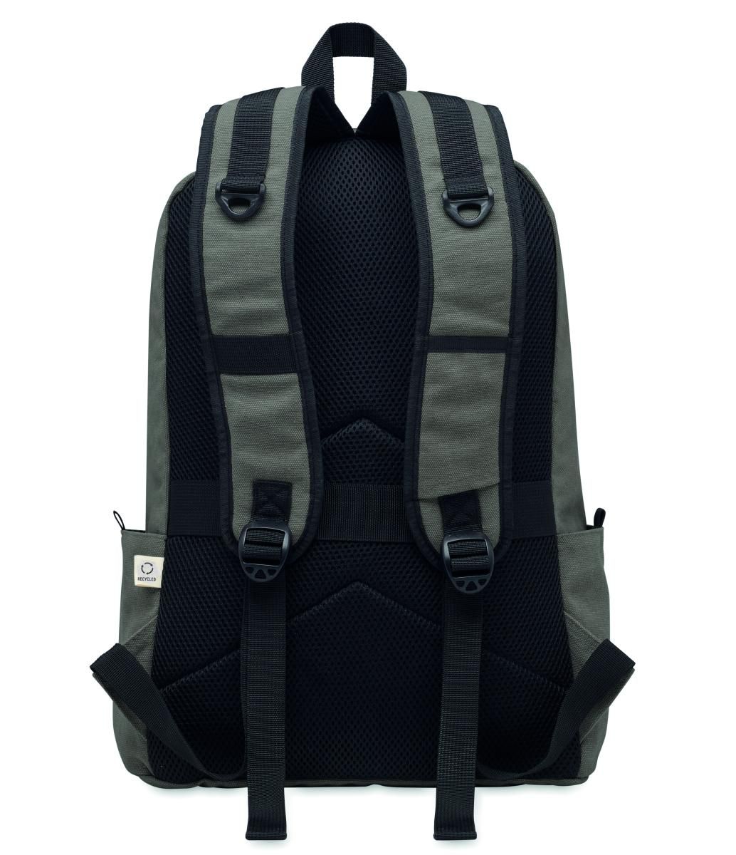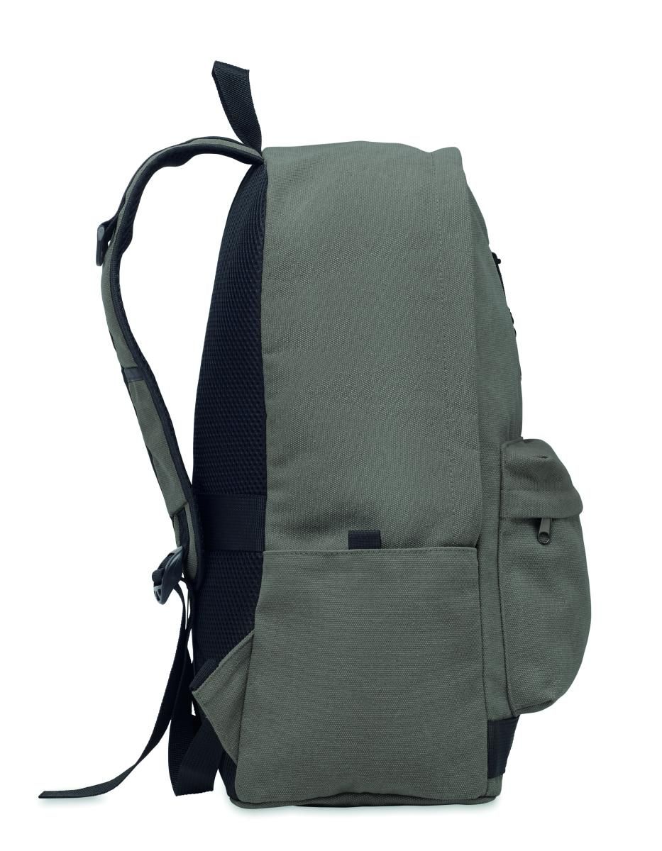 Mochila para portátil de 15'' en reciclada lona lavada. Gran bolsillo frontal con cremallera y compartimento interior para el portátil. Pequeño bolsillo frontal con cremallera. Dos bolsillos laterales. Espalda y hombreras acolchadas, panel trasero y parte inferior. 450 gr/m².