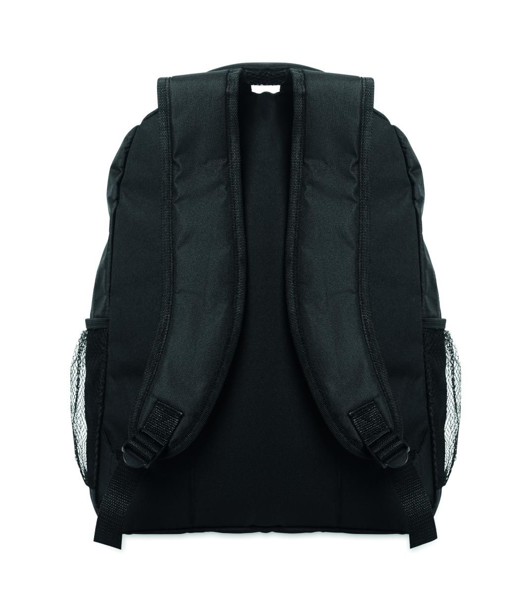 Mochila para portátil de 15 pulgadas en poliéster RPET 600D con compartimento acolchado para portátil en el interior, bolsillos de malla a ambos lados y bolsillo frontal con cremallera.