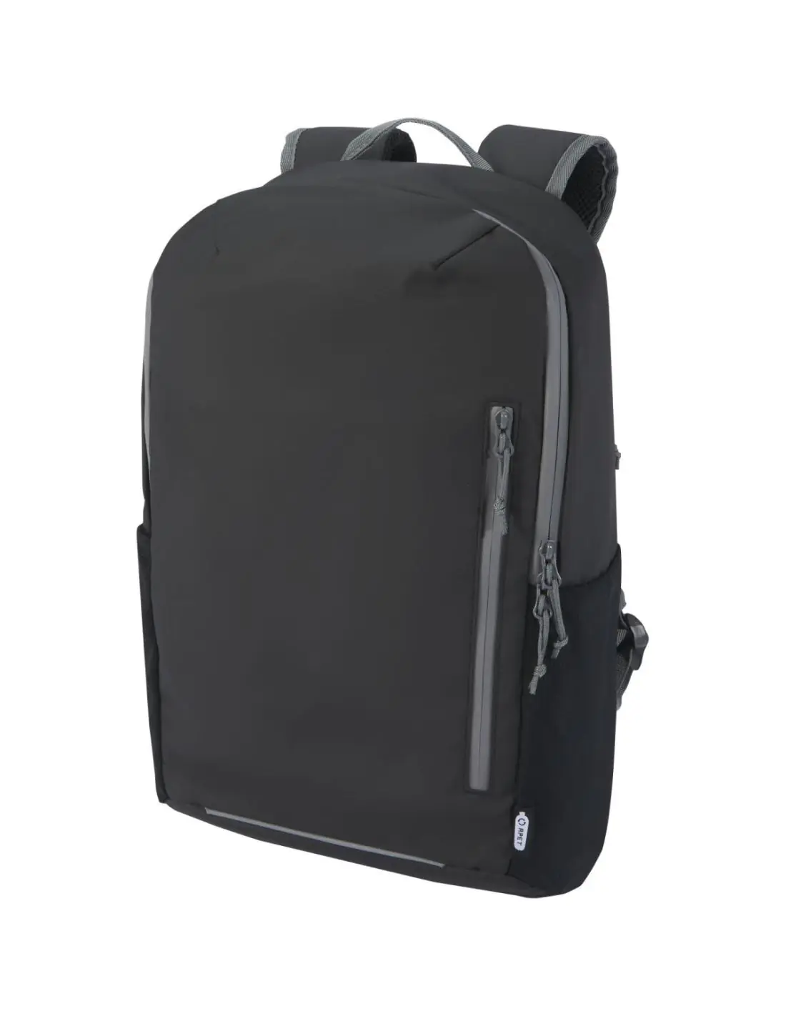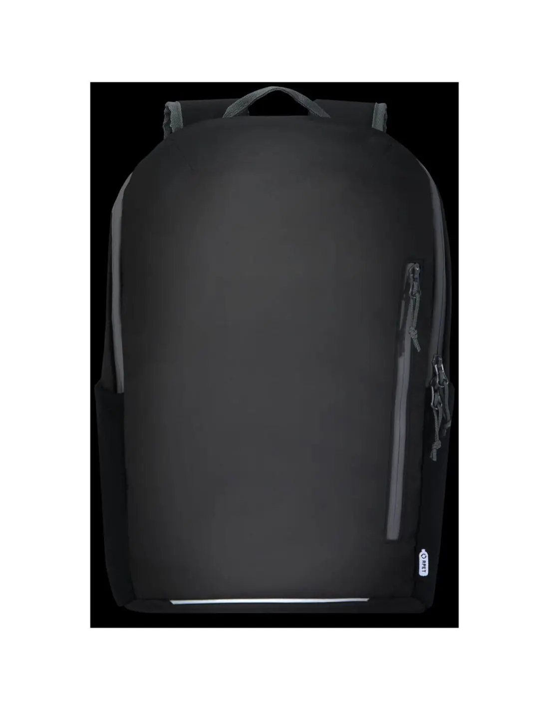 Mochila para portátil resistente al agua fabricada con materiales reciclados certificados GRS, incluidas las cremalleras. Cuenta con un compartimento acolchado para portátil de 15" con abertura lateral de fácil acceso, múltiples bolsillos de malla, bolsillo frontal con cremallera y ribetes reflectantes para mayor visibilidad. El espaldo moldeado y acolchado y la correa ajustable para el pecho hacen que sea cómoda de llevar incluso a plena carga. Los materiales reciclados GRS incluyen el tejido principal, el forro, las correas y las cremalleras. Capacidad: 21 litros. Sin PVC.